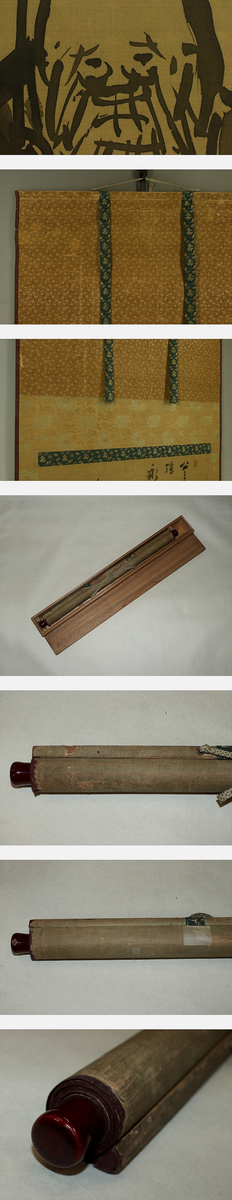 岸駒 がんく(1756-1839) 江戸時代中期-後期の画家。 宝暦6年生まれ。岸派の祖。はじめ狩野派を,のち沈南蘋や円山派などの画風をまなぶ。 鳥獣,とくに虎を得意とし,独自の画風を確立した。京都御所や金沢城の障壁画を制作。 天保9年12月5日死去。83歳。加賀(石川県)出身。 本姓は佐伯。名は駒,昌明。字は賁然。通称は雅楽助。号は華陽,蘭斎など。 本紙は、染み、汚れ、軽い折れ、皺、ヤケがあります。 表装は、染み、汚れ、折れ、皺、虫食、破れ、ほつれ、くすみ、ヤケ、修復痕、 軸先に汚れと傷みがあります。 【サイズ】 作品 横約50.5cm×縦約31cm 表装 横約60cm×縦約115cm |