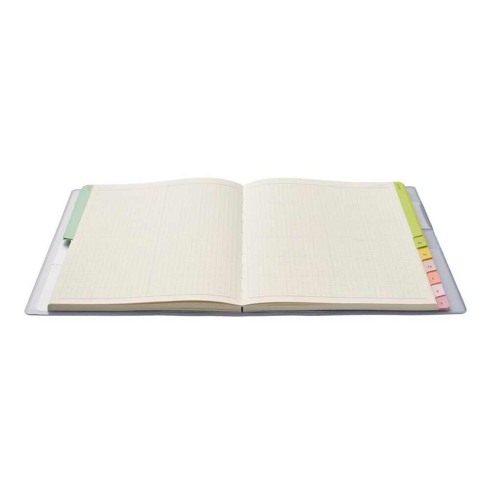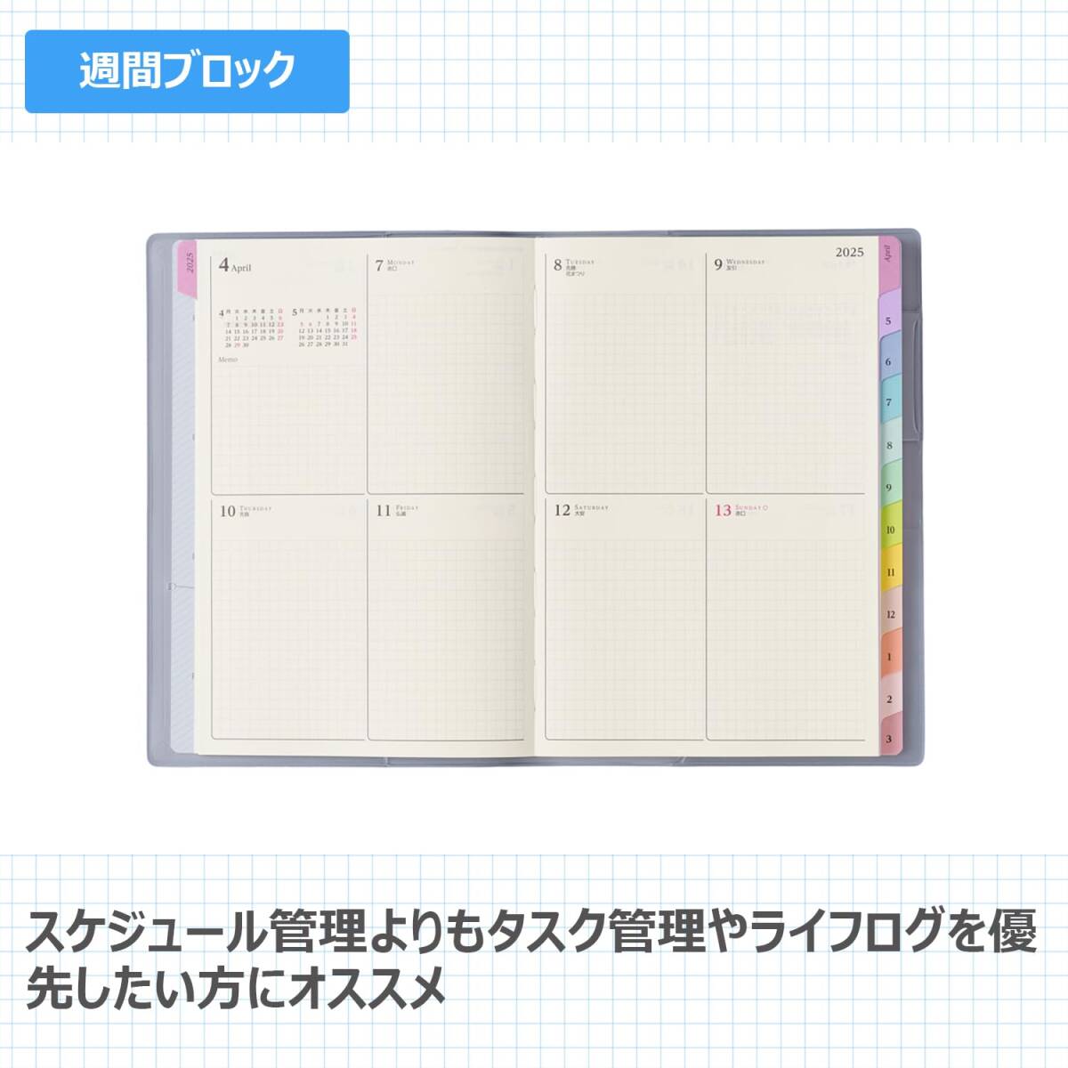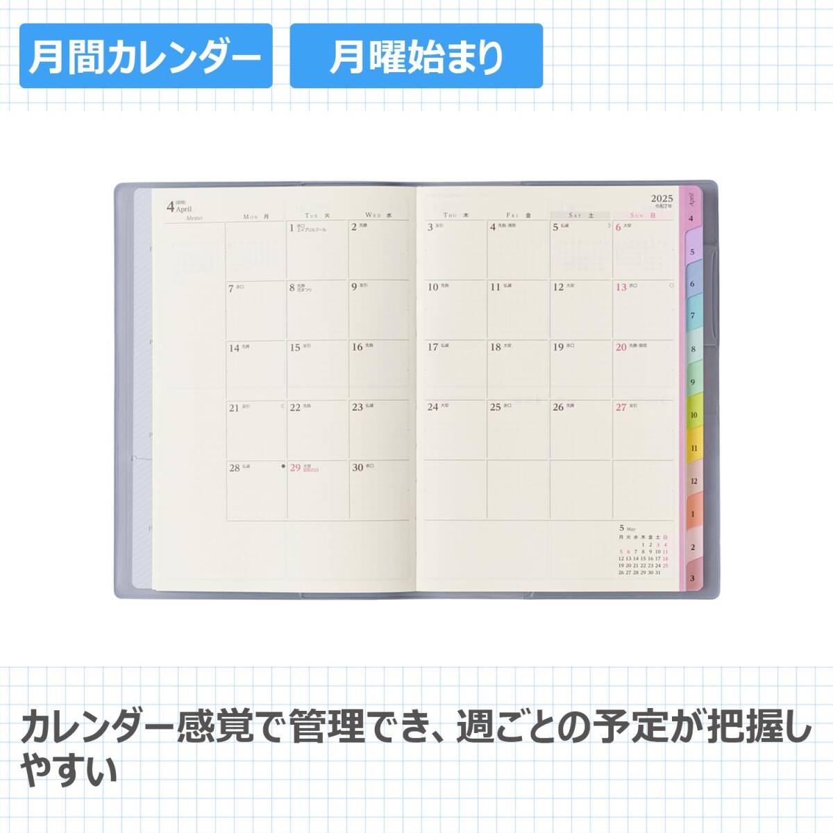 【月間ページ】見開き1ヶ月のベーシックなブロックタイプ(月曜始まり)。カレンダー感覚で月ごとの予定が把握しやすいのが特徴で、見たいページをパッと開けるインデックス付きです。
