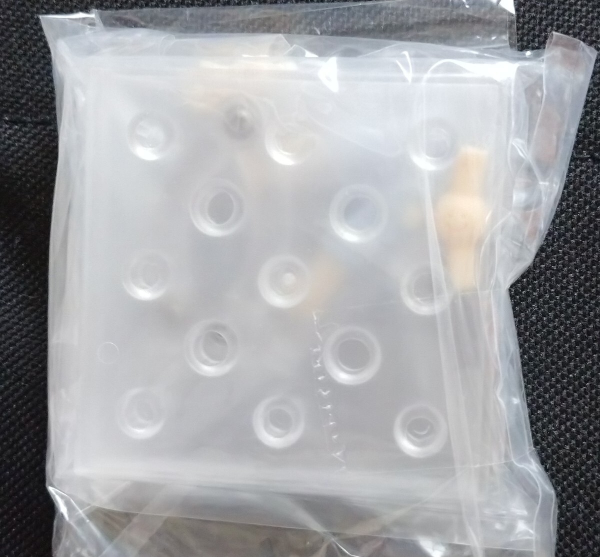 2枚目右上の袋に残りの腕パーツと台座が入っています。3枚目は袋の裏側です。