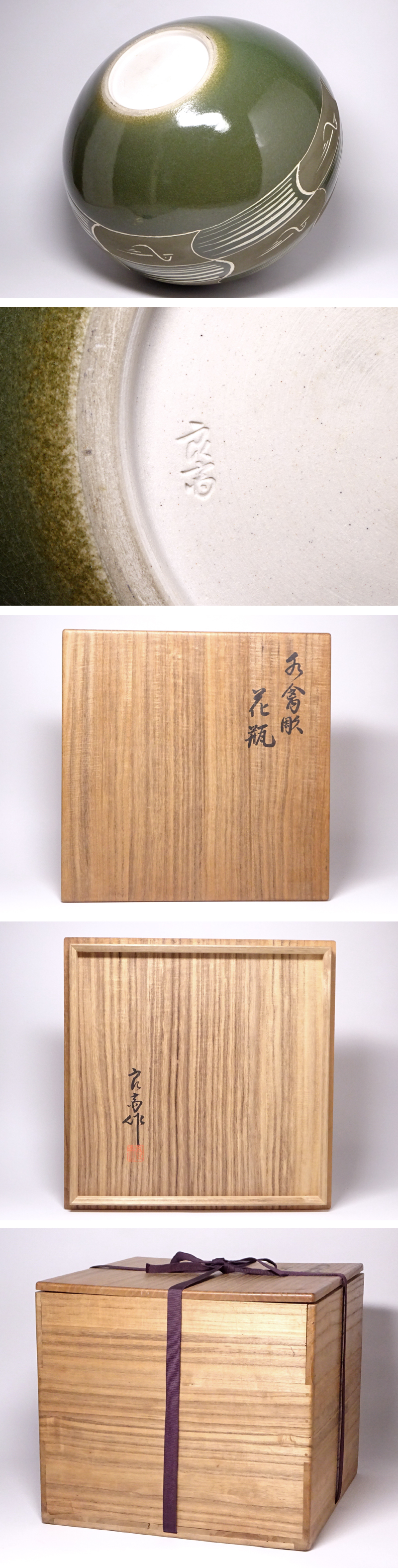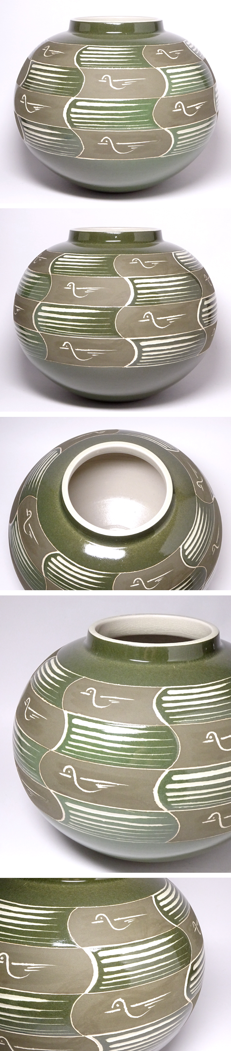 慶應◆日本芸術院会員【三代井上良斎】作 水禽彫花瓶 水鳥図壷 高さ22.5cm 共箱付 二代良斎・板谷波山に師事 收藏