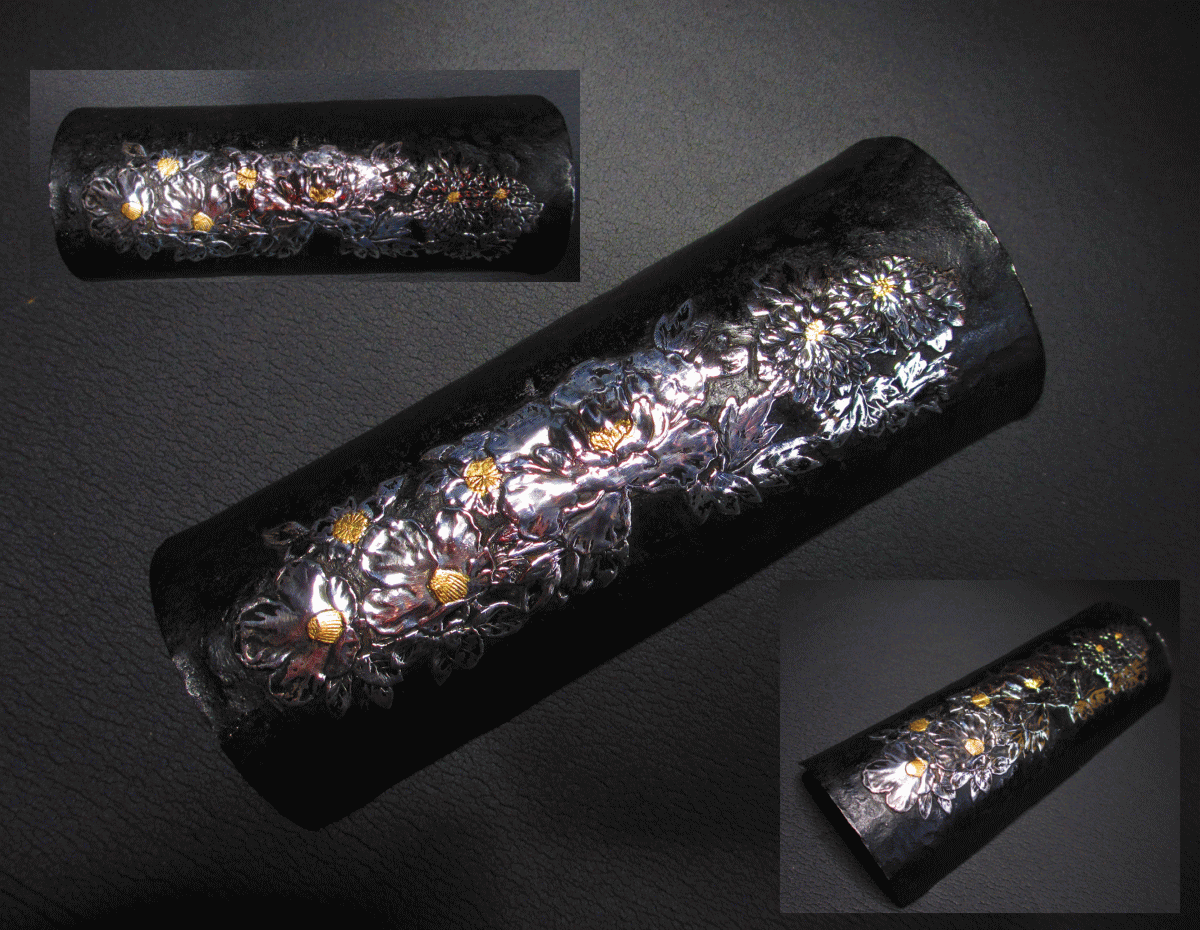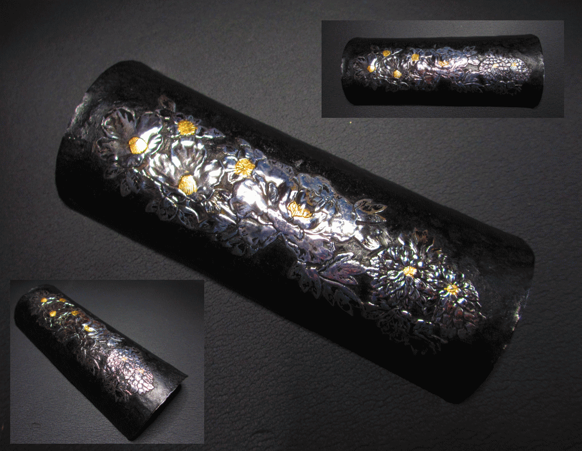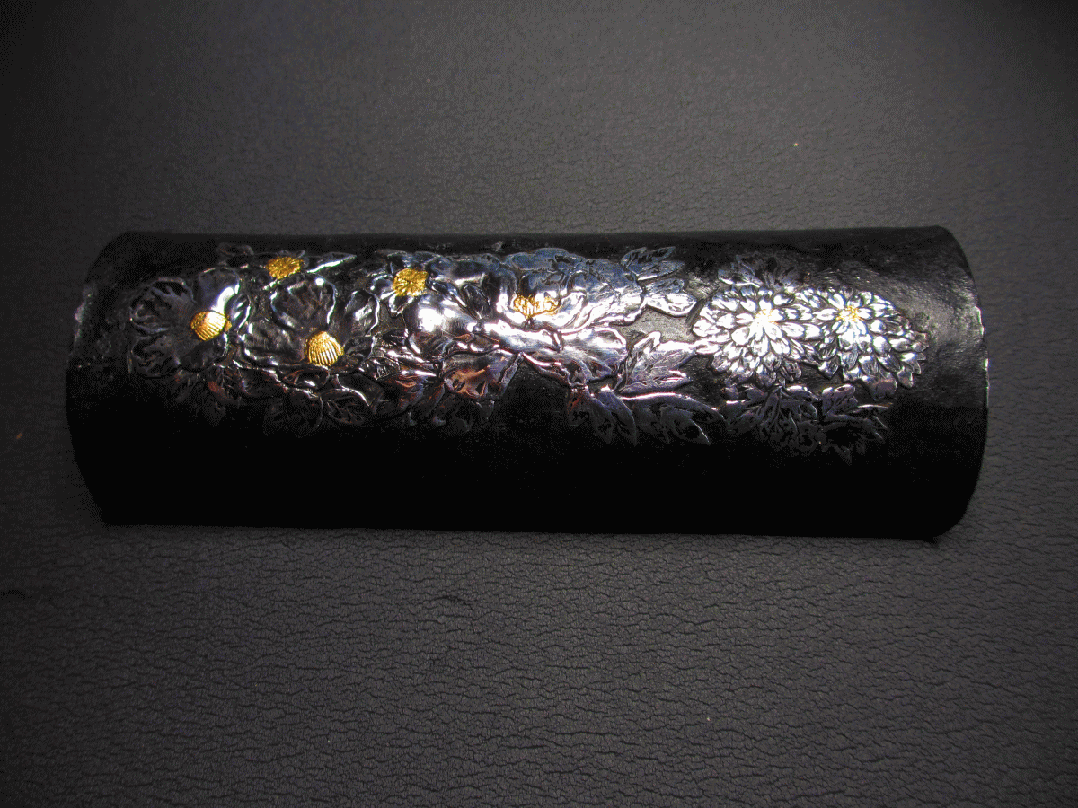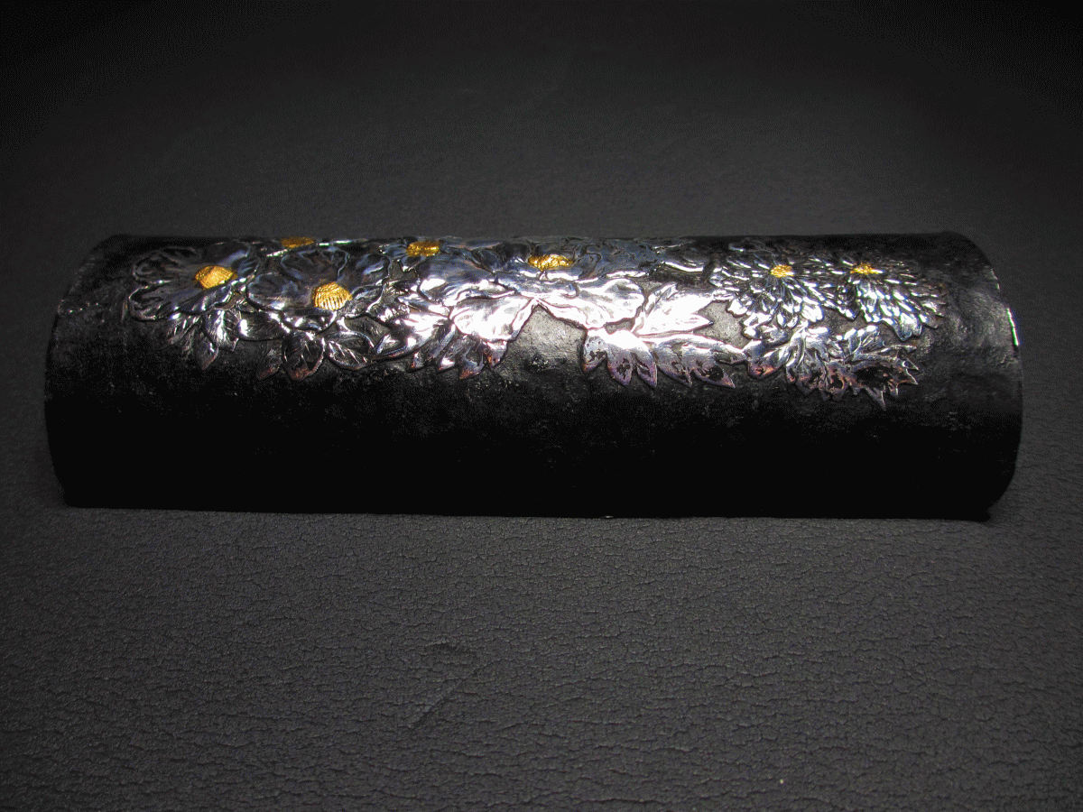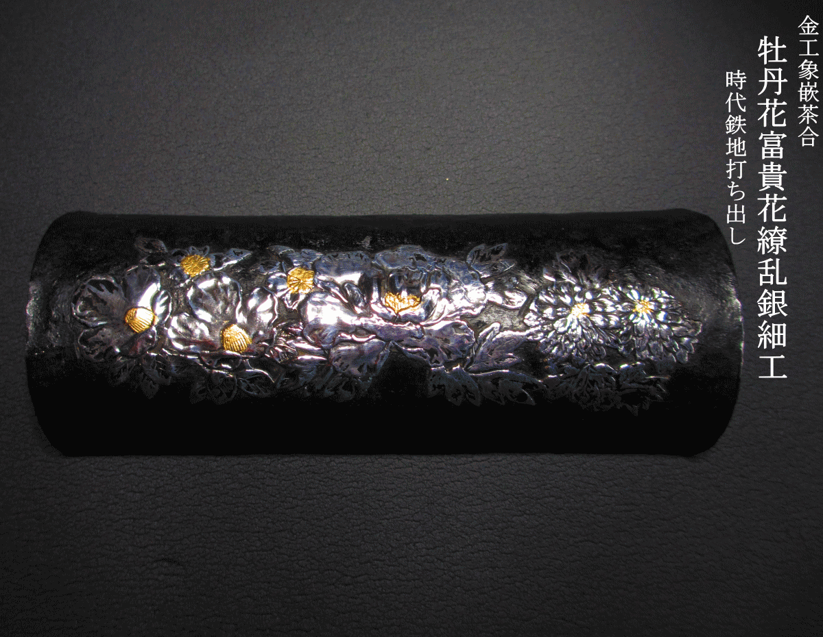 | 牡丹花富貴花繚乱銀細工 時代鉄地打ち出し 金工象嵌茶合 茶量 仙媒 煎茶道具 |
