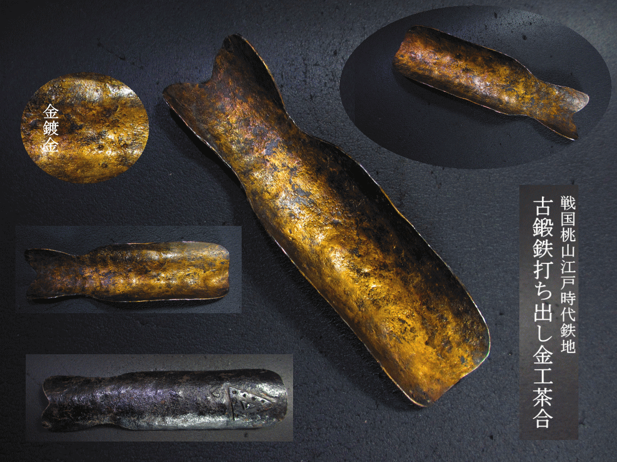 | 戦国江戸時代鉄地打ち出し金鍍金 魚形金工茶合 茶則 茶量 仙媒 煎茶道具 |
