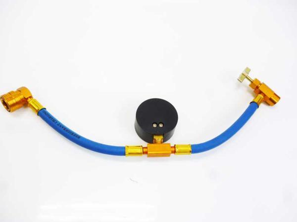 | 【商品名】 R134a用メーター付ガスチャージホース ガス200g1本付き 【商品詳細】            ・ガスチャージホース全長:約40cm ・対応冷却媒体 : R134a            ・簡易的なエアコンガス補充の際に使用できるガスチャージホースです。 R134a用となります。 ・ガス200g入り1本付きですぐに使えます。