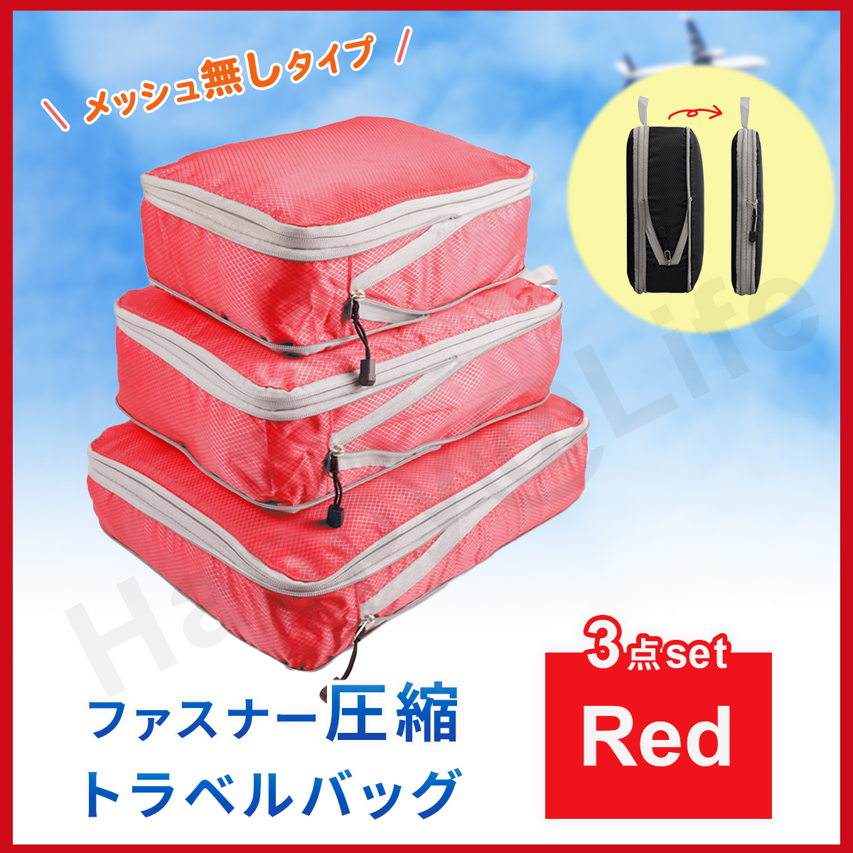 圧縮バッグ ファスナー トラベル ポーチ 収納ポーチ 3個セット 圧縮袋 メッシュ無し 赤 收藏