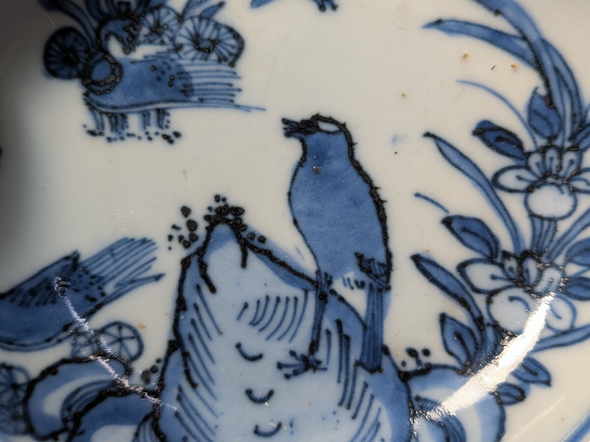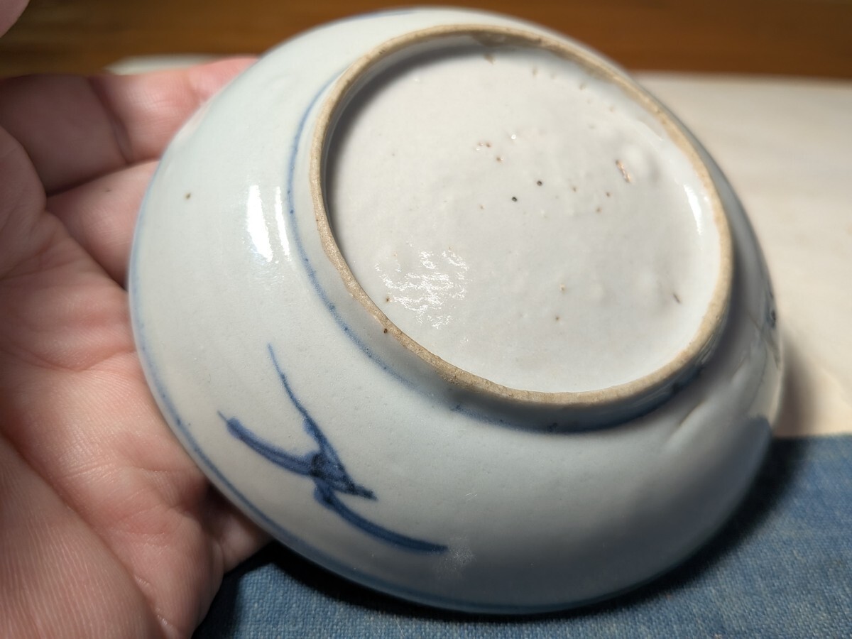古染付の平盃2種です。小皿の生まれですがしっかり深さがあり平盃に好適です。1客は花と鳥が3羽、真ん中の鳥は悪そうな顔をしています。縁に1カ所小ホツがありそこから2センチ程の入が出ています。パラパラと虫食いがあります。もう1客は岩山に帆掛け船と楼閣の図です。縁の窯傷が焼継になっているようでガラス質の皮膜が細く乗っています。図柄の世界に思いを馳せながら清々しくお酒がいただけます。・口径10.2センチ・高さ2.4センチ・明末清初 | 出价者 | 信用 | 价格 | 时间 |