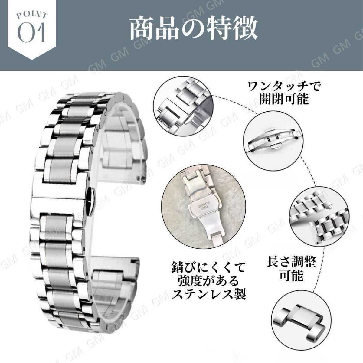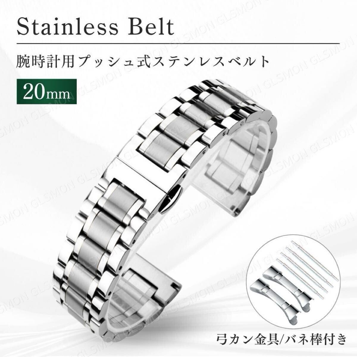 腕時計 ベルト 20mm 交換 替え バンド シルバー ステンレス ダブルプッシュ Dバックル 直カン 弓カン バネ棒 メンズ 鏡面 スマートウォッチ 收藏
