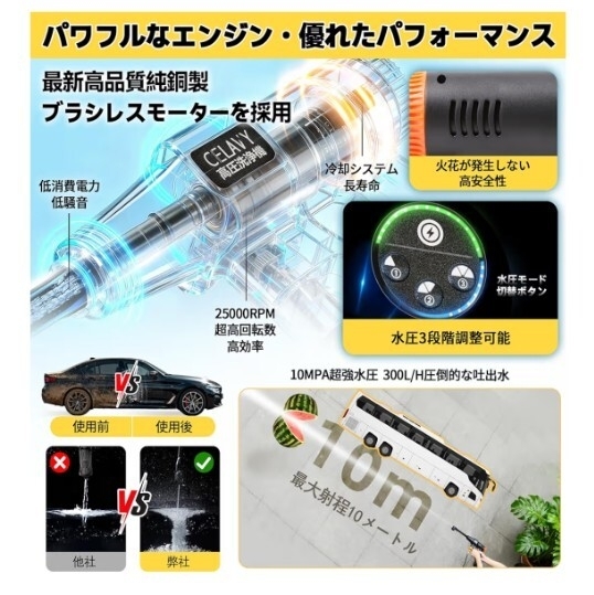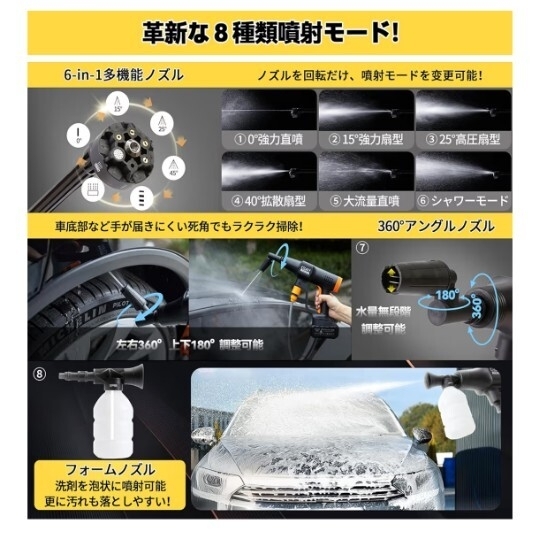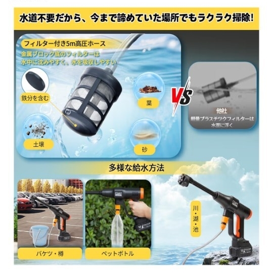 電気が通ってなかったり水道設備がないようなところでも車が洗えたりします。吹き出し口は強力な細い水流からシャワーのような水流まで ワンタッチで切り替えができます。