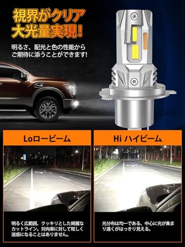 【優れた配光・新車検基準以上】29,900cd(カンデラ)ロービームビームは車検基準の約4,7倍の光量です。96,500cd(カンデラ)ハイビームビームは車検基準の約6,4倍の光量です。 h4 ledヘッドライトは純正ハロゲンと同じ発光点で、ダークゾーンはありません。カットラインがくっきりはっきり出ていて、均一に明るい!道が明るくはっきり見えるので、目が疲れない!車検対応の配光により、散乱光やグレア光さを防ぎ、対向車が眩しさを感じることがありません。※ご注意※本品は汎用品の為、車種側のリフレクターに依存する形となりますので、照射の形状と車検データは車種により異なる場合がございます。また、車検に関しては、地域により検査員の基準が異なる場合がございます。