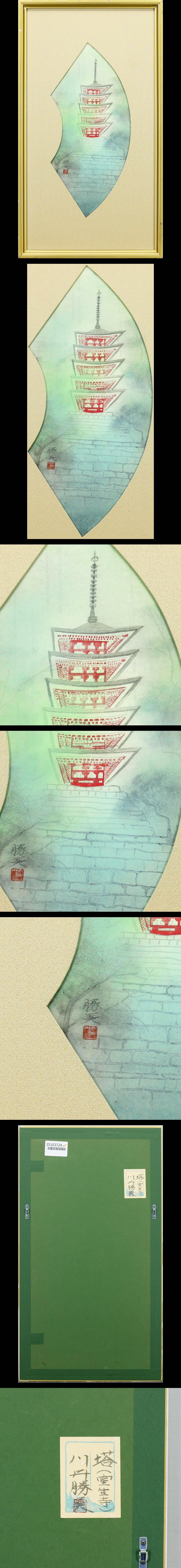 【真作】【WISH】川井勝美「塔(室生寺)」日本画 8号大 共シール 扇面 ◆霧の中に浮かぶ五重塔 〇師:月岡栄貴 日本美術院院友 #25103724 收藏