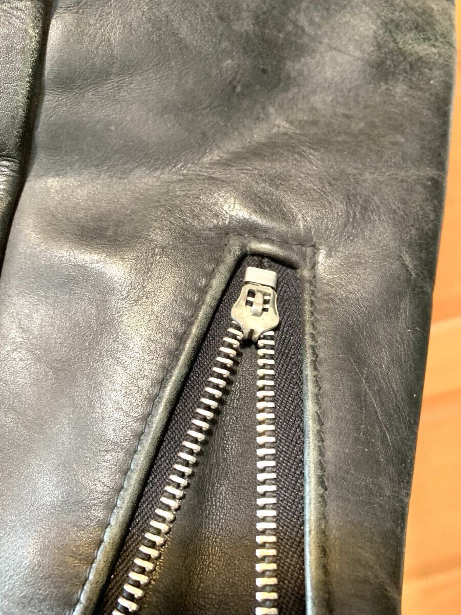 30年前に新品にて購入した1着です。バイカー御用達と言える革ジャンブランド「schott」。機能性に問わずロックバンドのイメージでも親しまれております。新品の綺麗さも良いですが、ホースハイド故のガンガン着こなしヴィンテージ感を出すのはお金では作れない「オンリーワン」な1着です。ボアインナー付きですので保温性も兼ね揃えております。フロントジッパーはYKK製。シンプルデザインだからこそ色々なボトムスに合わせられるメリットはあります。右袖ジッパー持ち手が欠損しておりますが、大事に着ていただける方の手に渡っていただければ嬉しい限りです。是非ご検討、ご入札お待ちしております。