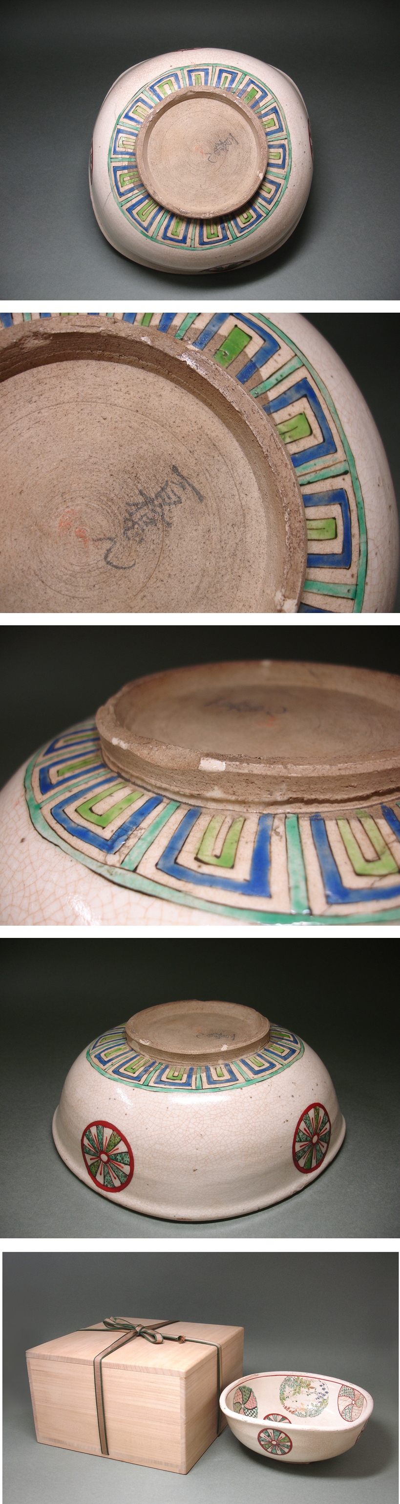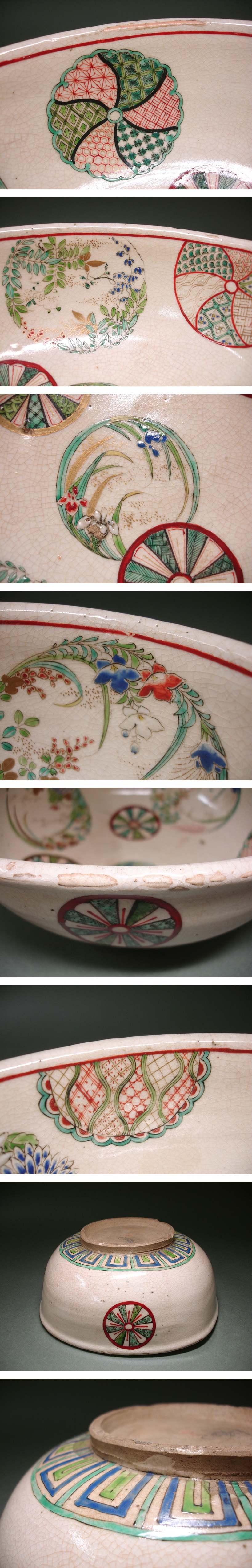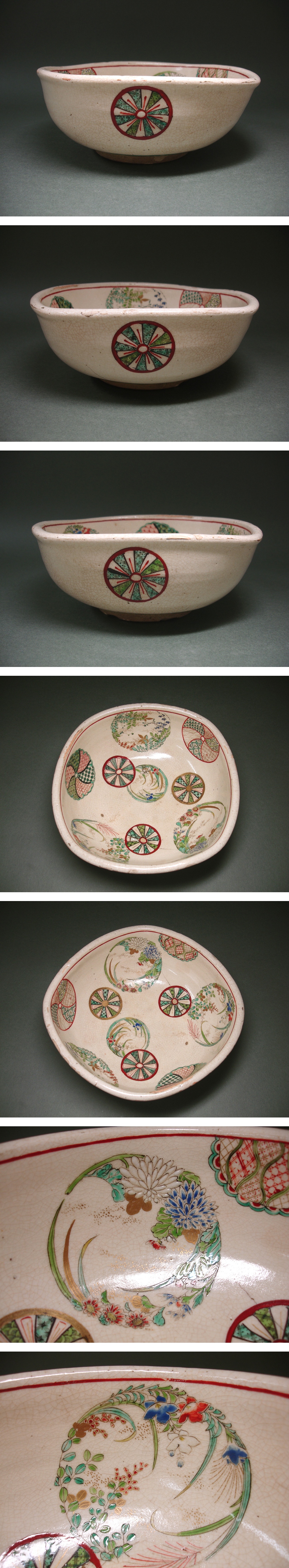 慶應◆江戸時代 珉平焼(淡路焼) 色絵花丸散し文 菓子鉢 阿波徳島藩御用窯 收藏