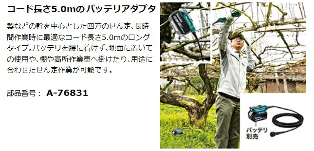 マキタ makitaバッテリアダプタセット品 A-76831 ※バッテリは別販売品です。■特長梨などの幹を中心とした四方のせん定、長時間作業時に最適なコード長さ5.0mのロングタイプ。バッテリを腰に着けず、地面に置いての使用や、棚や高所作業車へ掛けたり、用途に合わせたせん定作業が可能です。■仕様・コード長さ5.0m ■適用モデル・UP180