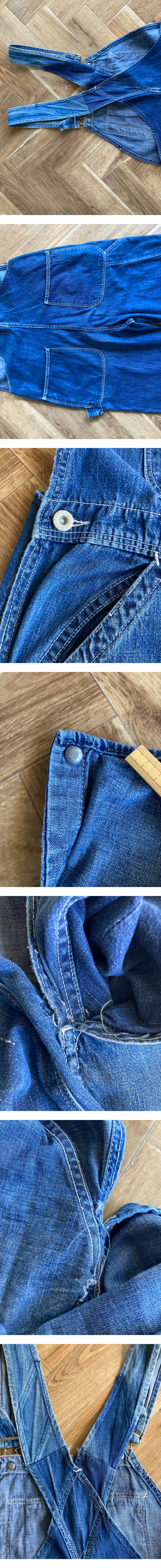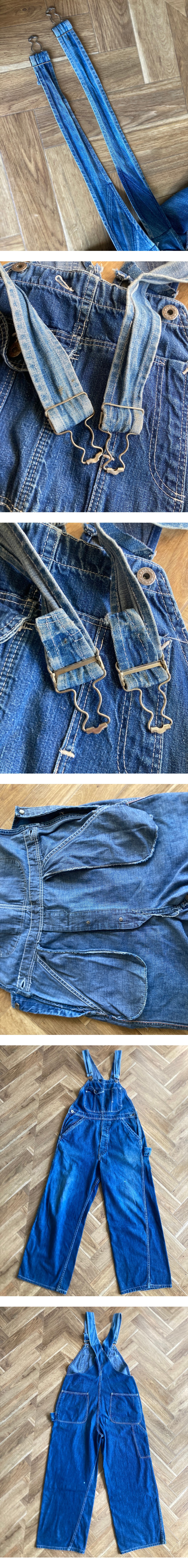 サスペンダーがちぎられて無くなっていたため、同じ大戦期のボーイズサイズのオーバーオールのサスペンダーをつないであります。色残りは違います。長さは十分に取ってありますが、ボーイズの物なので金具が小さめの物です。当時のオリジナルの金具なのでそのままのしてあります。