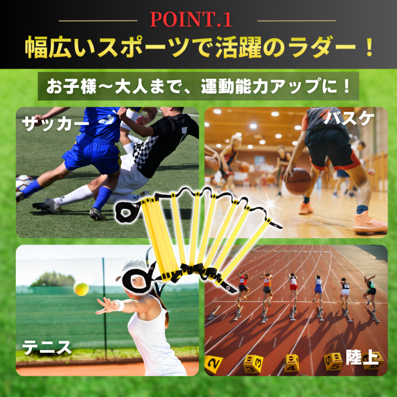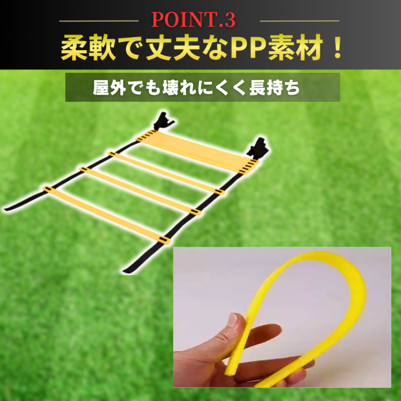 | 【商品概要】 屋内外で使えるトレーニング用ラダー(全長5m・10プレート)です。 俊敏性・瞬発力・体幹・反射神経の強化に役立ち、幅広いスポーツの基礎トレーニングに最適です。 サッカー・バスケット・ラグビー・テニス・野球などのアスリート練習から、 お子様の運動能力アップ、ダイエットやリハビリ目的にもご利用いただけます。 【特長】 ・広げるだけで簡単セットアップ ・プレート間の間隔は自由に調整可能 ・柔軟で丈夫なPP(ポリプロピレン)素材を使用 ・屋外でも壊れにくく長持ち ・軽量で持ち運びが簡単、専用収納袋付き | |||
