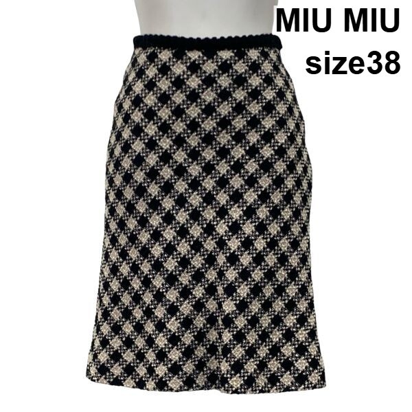 ● ミュウミュウ MIU MIU ツイードスカート 膝丈 千鳥格子柄 Aライン