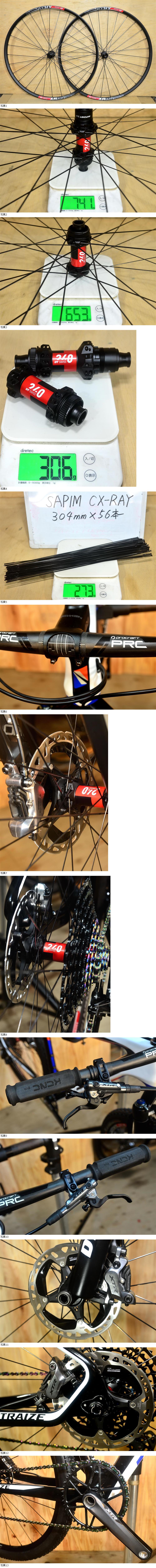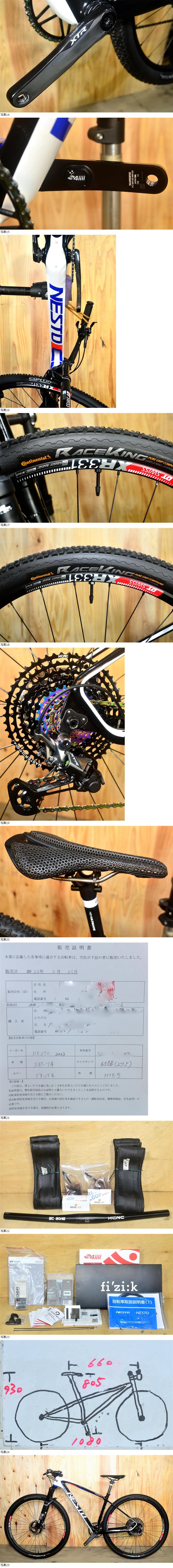 当方、自転車組立等の知識と経験はそれなりにはありますが、所詮は素人ですのでその事をご理解及びご考慮していただきますよう、ご不安がある様でしたらお近くのプロショップにて整備されてからご使用願います。 こちらの完成車に付きましては、右クランクとサドル除き未使用のパーツにて2023年10月に組見上げました。 フレームに付きましては2023年2月に未使用にて購入致し、特徴としましてはブースト規格ではないですが、付属のパーツにてエンド幅が12×142mm と9×135mm 2通りのハブ規格に対応しており、マウンテン・グラベル両方に対応したフレームかと思います。 ホイールに付きましても、2023年10月にリム・ハブ・スポーク等全て未使用パーツで自身にて組んでおり、横ブレ・縦ブレ・左右の出は突き詰めると切りがありませんので、1mm以内に収まる程度にて組んでおり、素人組みのホイールですので保証等はありませんので、気になる様でしたら現車確認して貰いましたら宜しいかと思います。 説明画像4番目、フレーム側のタイヤクリアランスに付きましては、650B (27.5) 仕様のフレームですが29インチ (700C) のタイヤも装着可能で、2.0インチ (約50mm幅) のタイヤでシートチューブのステー部分の隙間が約2~3mmでギリ装着可能です。 説明画像5番目、フロントフォークに OPEN=柔らかい DRIVE=硬い LOCK 3種のモードが有り、リモートレバーはついてませんが、手動にてライド中でも切り替え可能です。 こちらの車体は組み上げ後まだテスト走行しかしてないですが、ブレーキのメタルパッドの音鳴りが結構大きく、その他は良好で気になる様でしたら、レンジパッドに変更して貰いましたら宜しいかと思います。 付属のタイヤとハンドルはグラベル用で、32Cのタイヤは1セット実測重量300gで、タイヤ自体の残り山が、約5分山と約7分山程度ですので、おまけとお考え下さい。 現在タイヤの消耗度は、2025年1月12日の時点で約9分山程度で、その都度更新いたします。 BB芯~シートチューブ面一の寸法が17インチ(43.18cm)ですので、Mサイズ相当かと思いまして、ホイールベースが1080mmと27.5のせいかMサイズとしては短く、当方167cmの体格でもサドルの前後をいっぱいまで後ろにして丁度いい位です。 説明画像最後から2番目、サイズ的はこんな感じで当方167cm股下76cm正式なフィッティング計測はしてませんが、自身にとってしっくりくるポジションです。 各パーツ詳細 完成車実測重量:8.65kg フレーム情報 : 「https://nestobikes.com/products/traize_pro_275-k_frameset/」 実測重量:1.07kg フレーム ・ー・ー・ー・ー・ー・ー・ NESTO MTB TRAIZE PRO 27.5 17インチサイズ (2023) carbon Fフォーク ・ー・ー・ー・ー・ー・ー・ DT SWISS OPM 100 27.5 (650b) 2016 ヘッドセット ・ー・ー・ー・ー・ー・ FSA 1-1/8 to 1-1/2 ブレーキ キャリパー ・ー・ー・ー・ー・シマノ XTR BR-M9120 前後(N04A) ブレーキ レバー ・ー・ー・ー・ー・ー・シマノ XTR BL-M9120 左右 ブレーキホース ・ー・ー・ー・ー・ シマノ SM-BH59 ブラック 前後 ディスクローター ・ー・ー・ー・ー・ シマノ XTR RT-MT900 160mm 前後 ボトムブラケット ・ー・ー・ー・ー・ RIDEA Carbon Ceramic BB86 24AXLE クランク ・ー・ー・ー・ー・ー・ー・ シマノ XTR FC-M9120 170mm パワーメーター ・ー・ー・ー・ー・ 4iiii XTR M9100 170mm 左クランクのみ オーバルリング ・ー・ー・ー・ー・ ノーブランド 42丁 1×3-4 Aliexpressにて購入 スプロケット ・ー・ー・ー・ー・ー・ KCNC 12S 9-52T SRAM XD用 シフター ・ー・ー・ー・ー・ー・ー・ シマノ XTR SL-M9100 12S Rディレイダー ー・ー・ー・ー・ー・ シマノ XTR RD-M9100 SGS 1x12 ハンドル ・ー・ー・ー・ー・ー・ー・ PROCRAFT PRC 31,8 mm 9°matte grey 720 mm Carbon (680mmにカット) ステム ・ー・ー・ー・ー・ー・ー・ー・ NEWMEN Evolution SL 31,8 mm 70 mm 17° alloy サドル ・ー・ー・ー・ー・ー・ー・ー・ fi'zi:k ANTARES VERSUS EVO R3 ADAPTIVE シートポスト ・ー・ーー・ー・ー・ー・ NEW ULTIMATE EVO 27,2 mm UD matte 410mm carbon (100mmカット) リム ・ー・ー・ー・ーー・ー・ー・ー・ DT SWISS XR331 28H alloy 前後 Fハブ ・ー・ー・ー・ー・ー・ー・ー・ DT Swiss 240 28H MTB 15×10mm Rハブ ・ー・ー・ー・ー・ー・ー・ー・ DT Swiss 240 28H MTB 12×142mm XD 36T スポーク ・ー・ー・ー・ー・ー・ー・ SAPIM CX-RAY 304mm56本 前後 Black ニップル ・ー・ー・ー・ー・ー・ー・ー・ DT Swiss alloy squorx pro Lock 2.0×15mm 前後 Silver (Blackに自身で塗装) シーラント ・ー・ー・ー・ー・ー・ー・ Stan’s NoTubes QUART 50cc 前後 チューブレステープ ・ー・ー・ー・ー・ ノーブランド 23mm 前後 タイヤ ・ー・ー・ー・ー・ー・ー・ー・ Continental Race King Shieldwall 29x2.0 前後 チェーン ・ー・ー・ー・ー・ー・ー・ー・ Sram xx1 eagle chain rainbow グリップ ・ー・ー・ー・ー・ー・ー・ー・ KCNC EVA Black 付属品 (予備部品・パーツ等) ハンドル ・ー・ー・ー・ー・ー・ー・ KCNC SC BONE 31.6 600mm 9°(520mmにカット) タイヤ ・ー・ー・ー・ー・ー・ー・ー・ Continental Speed King CX 700x32C 2本(5分山と7分山程度) チューブ ・ー・ー・ー・ー・ー・ー・ー・ REVOLOOP 700c 