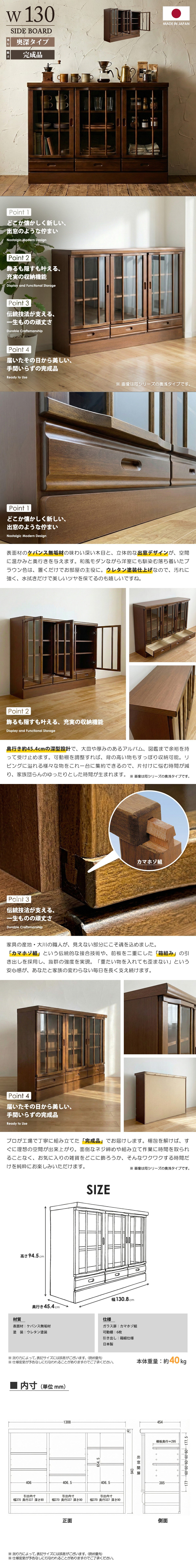 | 特 徴 | 木目の表情豊かなケバンス無垢材を使用し、どこか懐かしい「出窓」のようなデザインに仕上げた日本製サイドボード。 お気に入りの器や雑貨を美しく飾れるガラス扉に加え、細々した物をすっきり隠せる引き出しも完備。 | | 商品サイズ | 本体:幅130.8×奥行45.4×高さ94.5cm