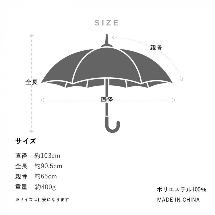 | サイズ | 親骨:65cm、全長:約91cm、直径:約104cm 個装サイズ:91.0×4.5×12.0cm |