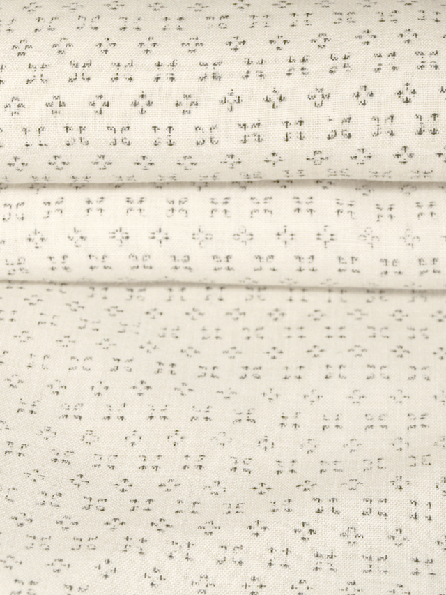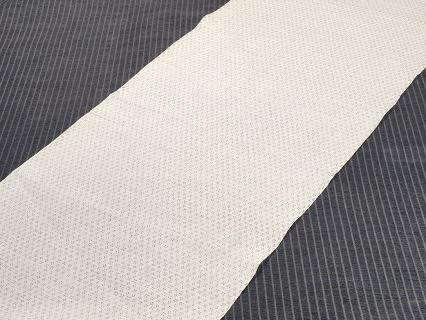 きなり色がかった白色の地に、墨色の絣で幾何学的な文様が織り込まれた、志賀麻上布の白絣のはぎれです。 昭和初期ごろにつくられたと思われるアンティークのお品です。やわらかな手ざわりの綿麻地です。 全体的にアンティークなりのくすみがあるほか、下端から約 70cm の右耳寄りに直径約 0.5mm の小穴が 1 か所、同じく下端から約 11cm の中央寄りに直径約 5mm 前後のうっすらとした黄変が 3、4 か所、約 61cm の中央付近に直径約 5mm の黄変が 1 か所ありますが、そのほかに目につく大きなしみやよごれ、褪色などのダメージはなく、この時代のものとしては、良好な状態です。生地の力もあります。 |