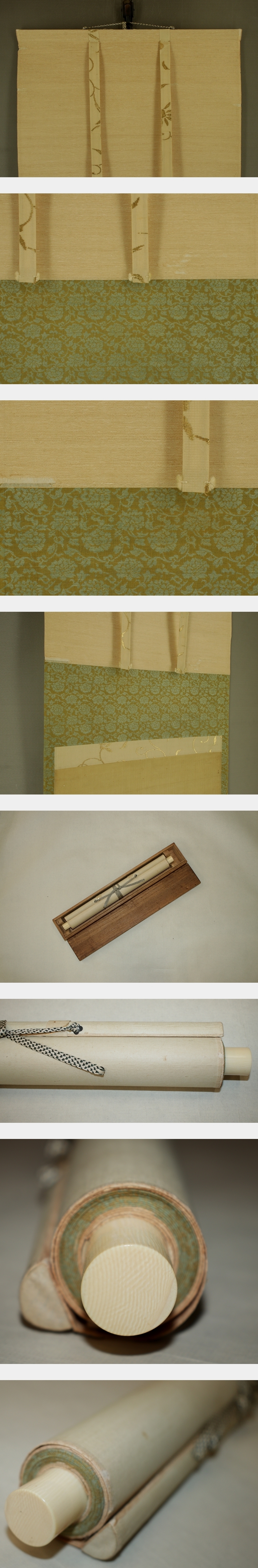 円山応挙 まるやま-おうきょ(1733-1795) 江戸後期の画家。円山派の祖。丹波生。 字は僊斎・仲選、号は一嘯・夏雲・仙嶺等、通称は主水。 石田幽汀に狩野派の画法を学び、幽汀の写生的画法に、 宋・元画の技法を取り入れると共に、西洋画の遠近法を研究して一家を成した。 動植物の写生を最も能くする。寛政7年(1795)歿、63才。 本紙は、染み、汚れ、軽い折れ、皺、ヤケ、虫食いがあります。 表装は、染み、汚れ、折れ、皺、虫食い、破れ、ほつれ、生地剥れ、軸先に汚れがあります。 【サイズ】 作品 横約33.5cm×縦約78cm 表装 横約37cm×縦約159cm |