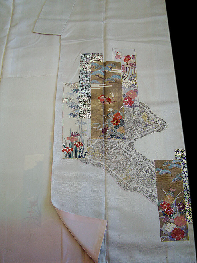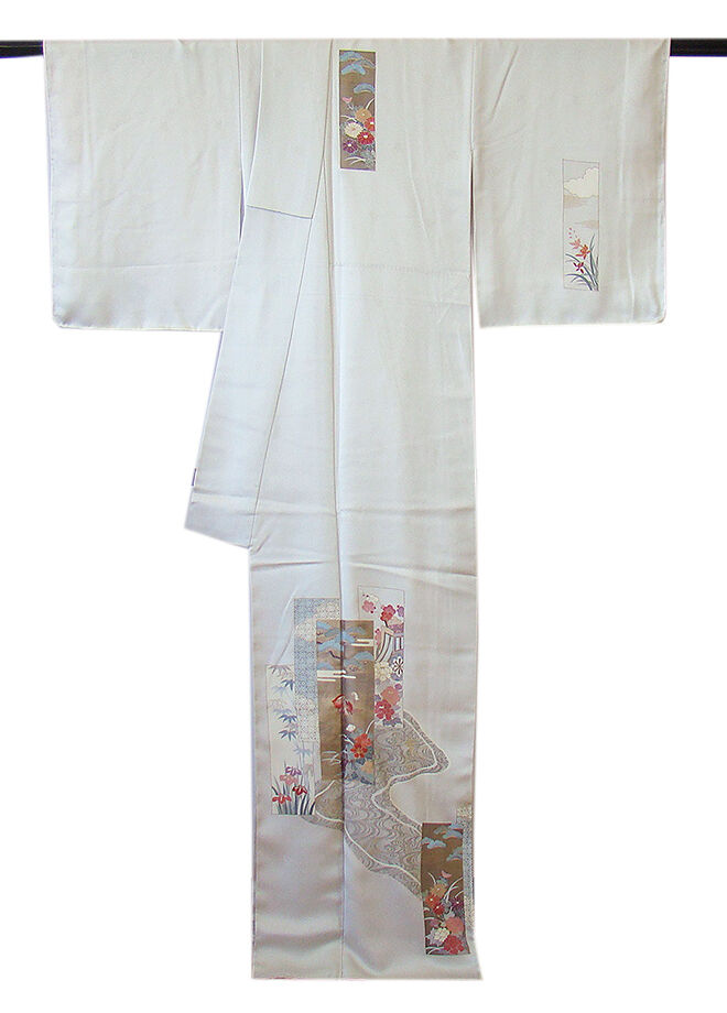 | 商品説明 | こちらのお品は「袷」ですので10月から5月までお召頂ければと思います。 とてもしなやかでさらりとした滑らかな手触りの着心地良い重めの紋意匠の生地、 紫水晶色地に地模様入りに色紙文、松竹梅、花木、鳥、流水、七宝文等の染柄に金彩加工仕立て、 八掛は淡いベビーピンク色(正絹)、幅広い年代の方にお召頂けます。 |