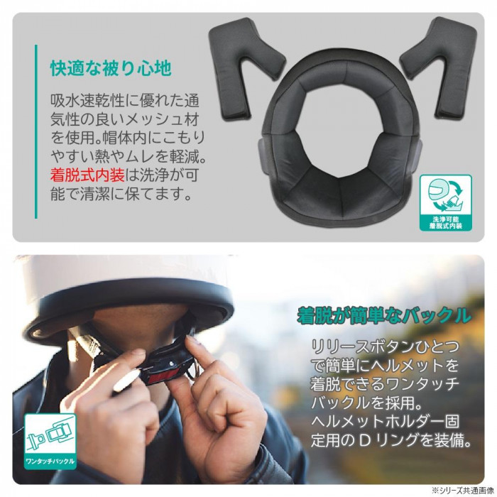 | リバイバルシリーズ代表作RX-100Rの後継モデル。内装は天井部に専用刺繍の織りネームを縫製したヘリテイジブラウンのサテンキルト、各パッドは吸水速乾性に優れたメッシュ素材を採用しています。あご紐は片手で着脱可能なワンタッチバックル仕様。高級感を演出しながら、快適性や利便性を向上させました。 |
