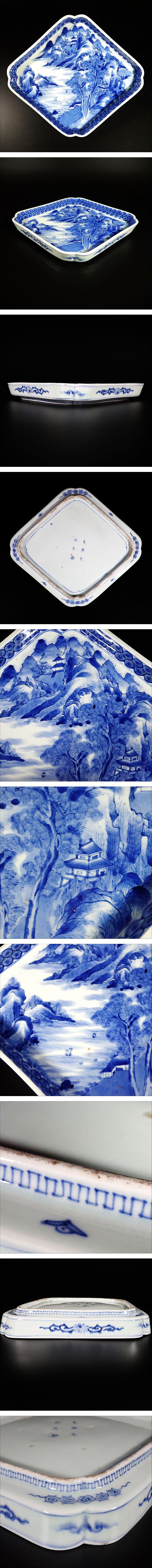 ■ 商品説明 山々が連なり、楼閣や家並みが点在する山水図を、染付で丁寧に描いた一枚です。 山の稜線や樹木、水辺の表現に古伊万里らしい伸びやかさがあります。 四方皿の形も相まって、絵画的な見応えがあり、眺めて楽しめる作品です。 |