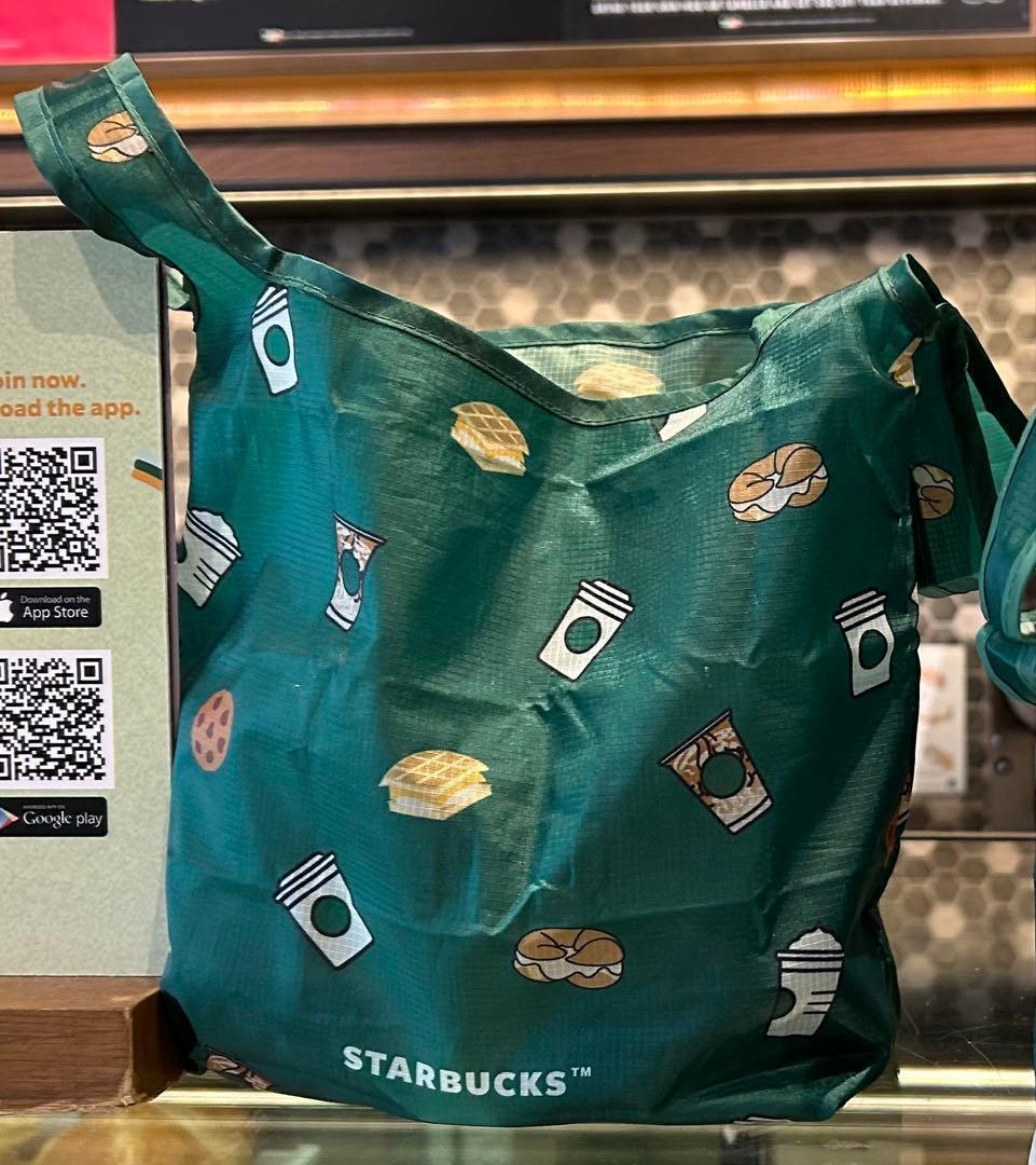 ドーナツとコーヒーカップのプリントが特徴の緑色エコバッグ。| 出价者 | 信用 | 价格 | 时间 |