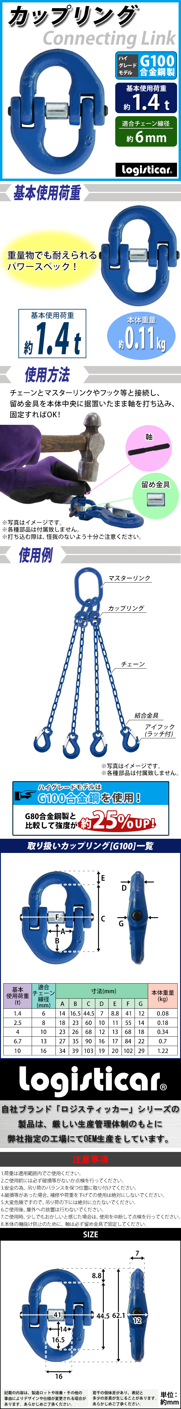 | 商品名 | 送料無料 カップリング 使用荷重約1.4t 約1400kg G100 鍛造 ハイグレードモデル カップリングリンク チェーンカップリング ハイカップリング コネクティングリング カップリンク つなぎ金具 吊り具 アイタイプ チェーンスリング 結合 ワイヤー ロープ 青 clink14tg100b |