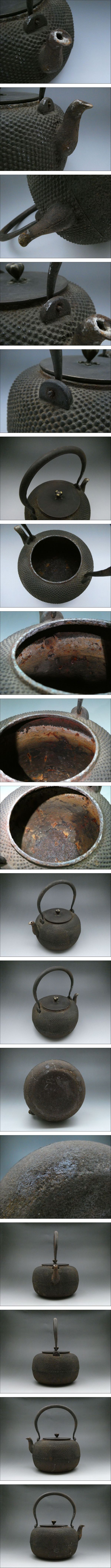 | ★商品★ ・鉄瓶【霰文鉄瓶】 ★銘★ ・龍文堂 (銅蓋) ★寸法★ ・高さ (約)26cm ※提手を含む ・胴径 (約)19cm ※注ぎ口を含まず ・口径 (約)10.5cm ★重量★ ・(約)2959g ★材質★ ・鉄製 ★状態★ ・経年による傷、汚れ、変色、錆などが見られます。 ・底面亀裂部分より、水漏れ箇所がございます。 ※備考※ 商品状態に関しては、あくまでも当方の見立てとなります。 程度には個人差がございますので、商品画像を良くご覧になられた上でのご入札お待ちしております。 |
