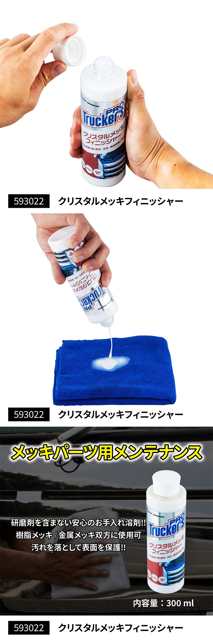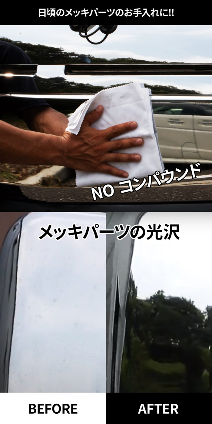 樹脂メッキ・金属メッキなどのメッキ全般に使用可能!普段のお手入れに最適な仕様! 研磨剤を使用していないので、傷をつけずにメッキの素材を選ばずメンテナンスが可能!! メッキパーツを劣化させずにお手入れができる新しいアイテム。 ![]() ![]() ![]()