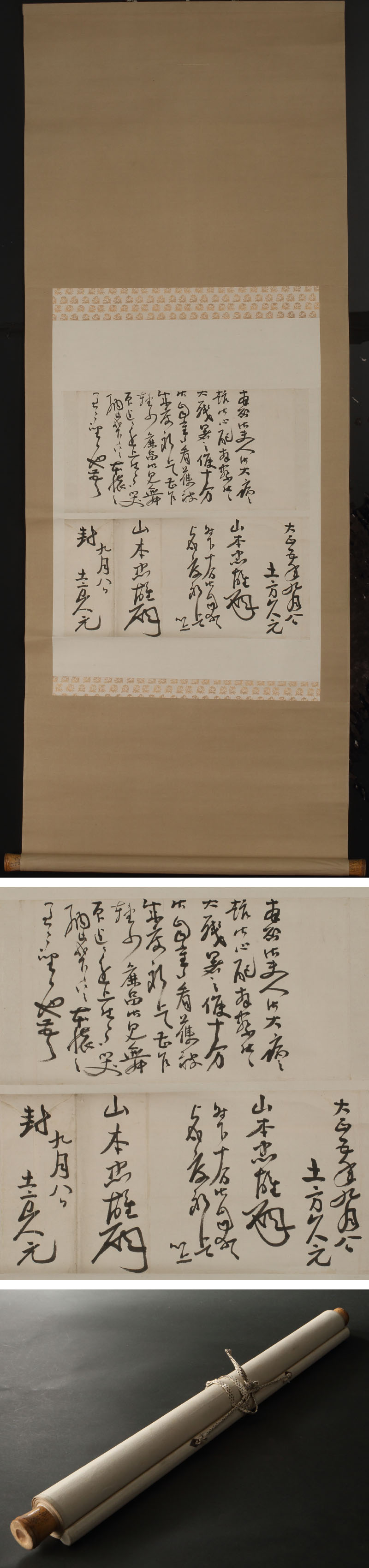 土方久元の書翰です。 大正5(1916)年、山本忠雄なる人物に宛てた書で、夫人の大病を看護する忠雄を気遣い、見舞いの品を贈る旨を認めております。特筆すべきは、9月に「大残暑」の記述が存することで、同年は各地で風水害が多発したほか、連続真夏日が旭川や那覇で記録され、双方2020年代まで100年余り記録が破られなかったことが知られます。 最晩年の極めて珍しい逸品です。 ◆土方久元 幕末-明治期の武士,政治家。土佐高知藩士。三条実美の衛士,学習院御用掛となる。中岡慎太郎らと薩長同盟の成立に尽力した。明治20(1888)年第1次伊藤内閣の農商務相。同年宮内大臣となり,翌年枢密顧問官を兼任。大正7(1918)年没、86歳。通称は楠左衛門。号は秦山。著作に「回天実紀」。 〔本文〕 拝啓御夫人御大病之 趣、御心配拝察仕候、 大残暑之候、十分 御自全御看護被 成度祈上候、甚乍 軽少廉品御見舞 印迄ニ進上仕候、御笑 納被成下候も本懐之 至ニ望候也、頓首 大正五(1916)年九月八日 土方久元 山本忠雄様 (尚々書) 時下、十分御自愛 被成度祈上候、以上 〔便箋〕 山本忠雄様 封 九月八日 土方久元 寸法:高さ138cm、幅51cm(最大幅。若干の誤差はご了承下さい) 状態:経年のイタミがございます。 |