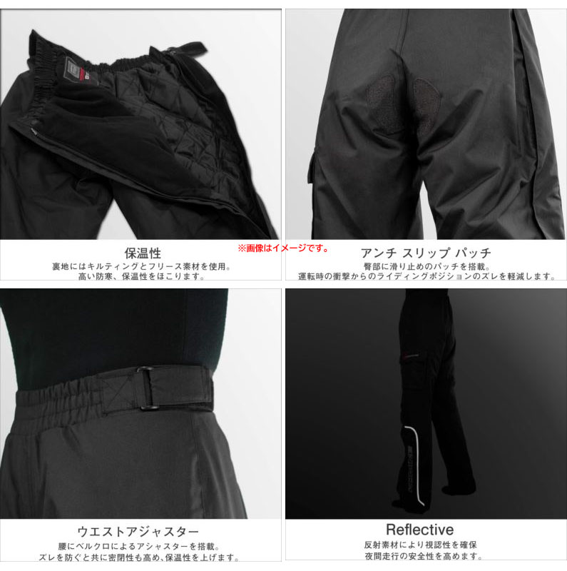【商品特長】 ◆片側がジッパーでフルオープンになるサイドジッパー方式で、脱ぎ着がしやすいモデルです。 ◆防水素材を使用した暖かいウィンターオーバーパンツ。 ◆夜間被視認性を高めるリフレクターを配置しています。 ◆用途に合わせて裾が絞れるのでバタツキも抑え、快適に走行が可能です。 ◆便利なカーゴポケットを装備しています。 ◆防風・防水・保温 といった、ウインターシーズンのライディングに不可欠な機能をお求めやすい価格にパッケージしたアイテム。 | |||||||||||||