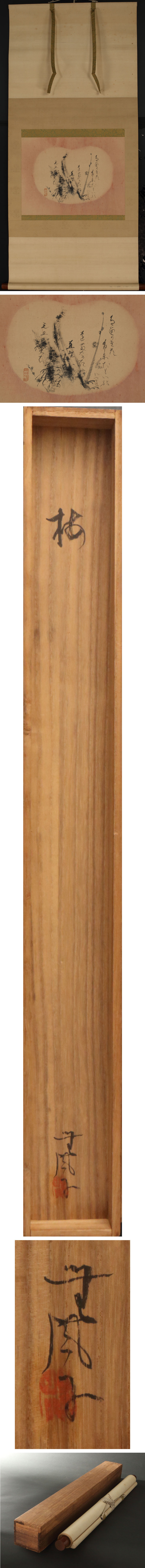 藤井達吉の墨絵です。 筆に任せて梅を画き、「梅かき道ふと思い出にき幼きも 直だもちかへる元旦のみち」と認めております。 溌剌たる創作意欲と幼時の郷愁に溢れた逸品です。 ◆藤井達吉 明治~昭和期の工芸家。名古屋で七宝店につとめたのち美術工芸の道をこころざし、新感覚の染織、紙工芸などを発表する。工芸革新運動にもくわわり、小原工芸和紙や瀬戸の陶芸も指導した。昭和39(1964)年没、83歳。 〔賛〕 うめかき道 ふとおもいて にき をさなきも 直たもちかへる 元旦のみち(印) 付属:共箱が付属します。 寸法:高さ121cm、幅55cm(最大幅。若干の誤差はご了承下さい) 状態:経年のイタミ、シミ有がございます。 |