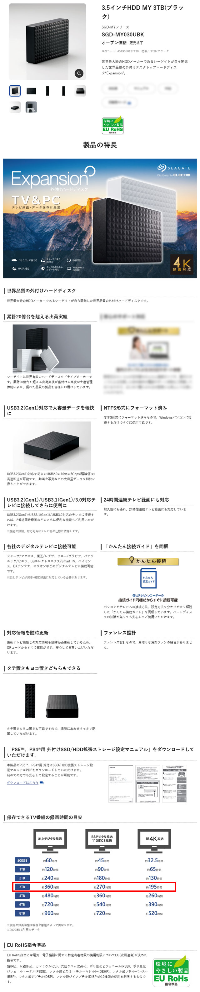 SEAGATE(エレコム) 3TB外付けハードディスクドライブ Expansion Desktop Drive SRD0NF2(SGD-MY030UBK) を出品いたします。 ■特徴■ 世界最大級のHDDメーカーである シーゲイトが自ら開発した 世界品質の外付けデスクトップハードディスク “Expansion”。 世界品質の外付けハードディスク 世界最大級のHDDメーカーであるシーゲイトが 自ら開発した世界品質の外付けハードディスクです。 累計20億台を超える出荷実績 シーゲイトは世界有数のハードディスクドライブメーカーです。 累計20億台を超える出荷実績が裏付ける 高度な生産管理体制により、 優れた品質の製品を皆様にお届けしています。 USB3.2(Gen1)対応で大容量データを軽快に USB3.2(Gen1)対応で従来のUSB2.0の 10倍の5Gbps(理論値)の高速転送が可能です。 動画や写真などの大容量データを軽快に扱うことができます。 USB3.2(Gen1)/USB3.1(Gen1)/3.0対応テレビに接続してさらに便利に USB3.2(Gen1)/USB3.1(Gen1)/USB3.0対応のテレビに接続すれば、 2番組同時録画などのさらに便利な機能もご利用いただけます。 ※機能の詳細、対応可否はテレビ側の仕様に依存します。 24時間連続テレビ録画にも対応 耐久性にも優れ、 24時間連続テレビ録画にも対応しています。 各社のデジタルテレビに接続可能 シャープ/アクオス、東芝/レグザ、 ソニー/ブラビア、パナソニック/ビエラ、 LGエレクトロニクス/Smart TV、ハイセンス、 DXアンテナ、オリオンなどのデジタルテレビに接続可能です。 ※但しテレビがUSB-HDD録画に対応している必要があります。 ファンレス設計 ファンレス設計なので、 耳障りな冷却ファンの騒音がありません。 タテ置きもヨコ置きどちらもできる タテ置きもヨコ置きも可能ですので、 場所にあわせすっきり配置していただけます。 ■仕様■