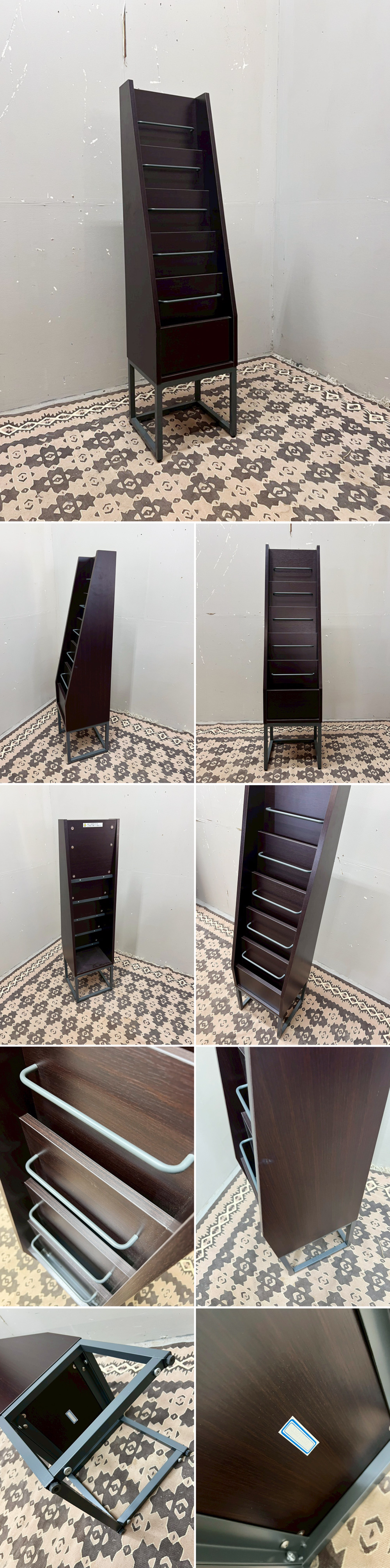 深みのあるダークブラウンの木目パネルにブラックのバーを配した、非常にスタイリッシュなディスプレイスタンドです。