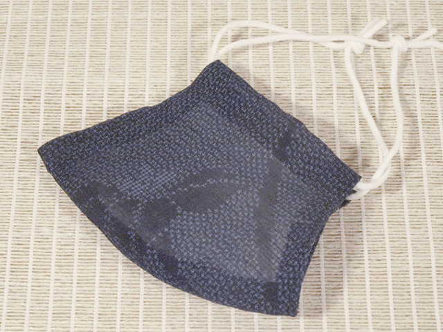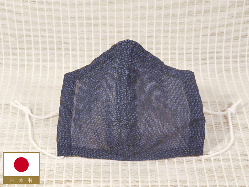濃藍色の地に、絣で杜若(かきつばた)の文様が織り込まれている、夏紬地の和装マスクカバーです。日本国内製ハンドメイドのお品です。ノーズワイヤーが入っており、交換も可能です。裏地には白色無地の阿波しじら織の綿地が配されています。 十日町で織られた夏着物用の未使用の織地から製作されたもので、透け感があり、涼やかです。裏地の阿波しじら織はシボの凹凸があり、強い吸湿性と高い速乾性があるので、肌にまとわりつかず、快適です。裏地との間にはポケットがあり、フィルターを入れていただければ本格的なマスクになります。また、マスクなので夏季以外にお使いいただいても問題はありません。耳掛けのゴムはご自身で調節の上、結び目をマスク端部のループ内に入れることができます。 新品です。未使用の織地を素材としているので、気持ち良くお使いいただけます。ハンドメイドですので、若干の縫製のムラ、ゆれなどはあるかもしれませんが、ご理解、ご了承くださいませ。 |