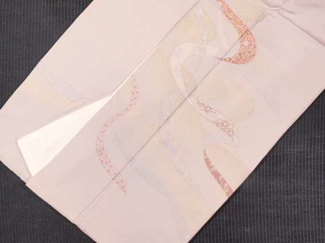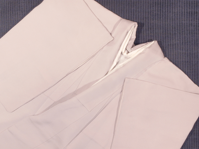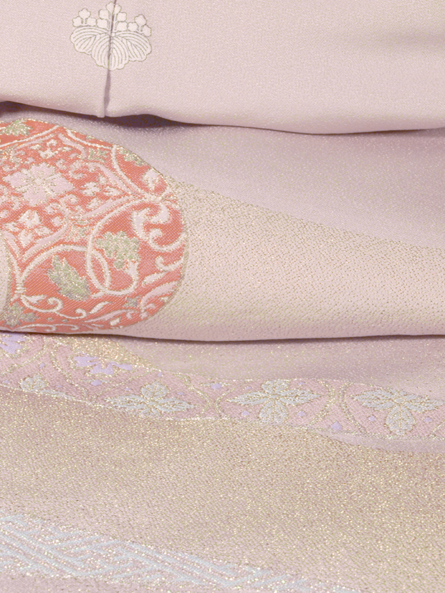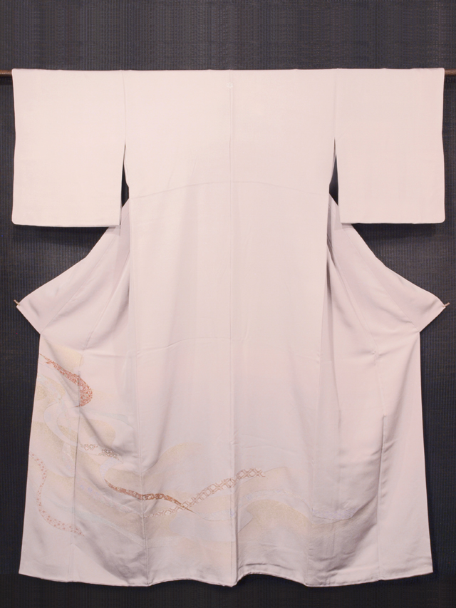 淡い桜鼠(さくらねず)色の地に、金糸でぼかしの流水の地紋が織り込まれ、唐花草や紗綾形(さやがた)、蜀江錦(しょっこうにしき)などの小紋が配された熨斗(のし)の文様が織り込まれている、一越(ひとこし)縮緬の色留袖です。比翼仕立てです。染め抜きで「五三桐」の一つ紋が付いています。 裾模様が染めではなく、すべて織りで施されている豪奢なつくりになっています。なめらかでやわらかな手ざわりのシボのややこまかな一越縮緬地です。とても優美で流麗な印象の意匠です。 ユーズド品で、両衿山にごくわずかなくすみがありますが、ほとんど判別はつきません。また、左前袖のたもと上に直径約 5mm-1cm のごくごくうっすらとした変色が 3 か所ありますが、それほど判別はつきません。比翼の袖口へり裏がごくうっすらと黄変気味ですが、そのほかに目につく大きなしみやよごれ、褪色などのダメージはないので、気にされない方であればご着用は可能と思われます。変色をお手入れできれいにしていただければ、立派なお着物になりそうです。 |