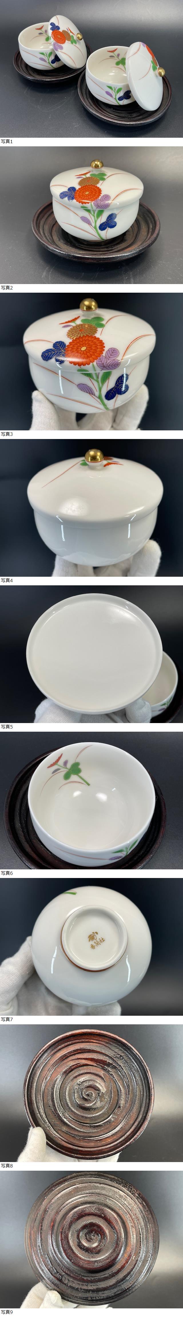 | 香蘭社 菊紋 蓋付湯呑 2客 木製茶托付き 口径約8.5cm×高さ約6cm 茶托直径約13.5cm USED品 |