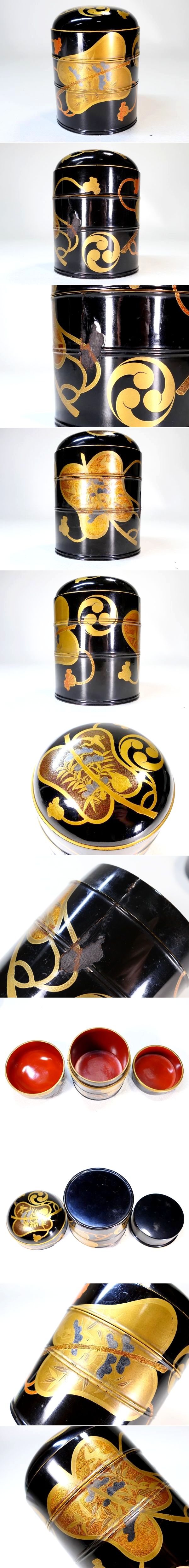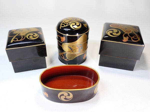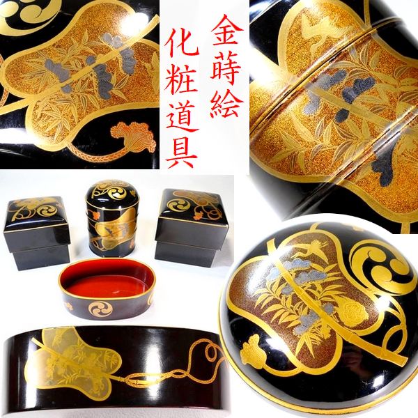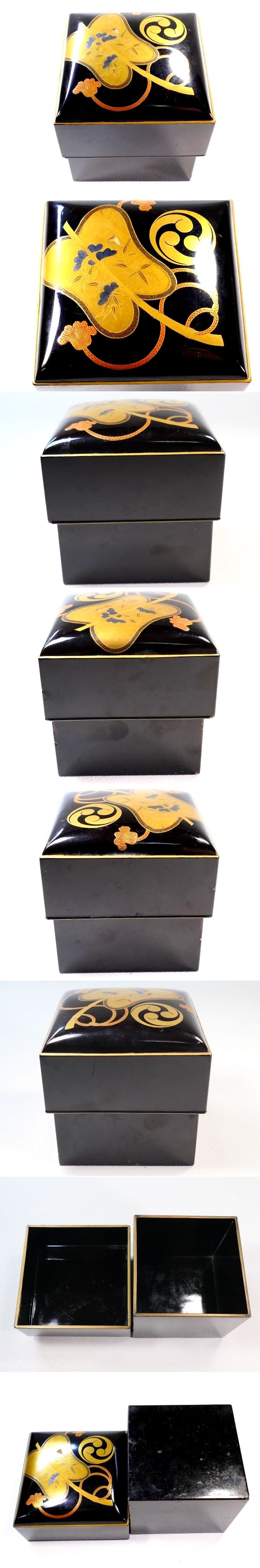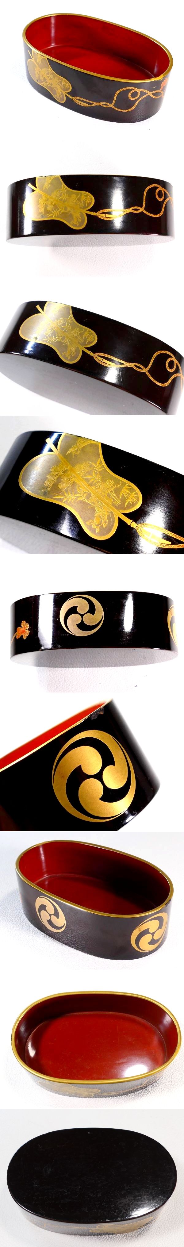 | 商品説明 | ~それぞれの寸法寸法~ 高さ 約 10.0cm 直径 約 7.6cm 縦幅 約 8.7cm 横幅 約 8.7cm 高さ 約 8.6cm 縦幅 約 7.8cm 横幅 約 7.8cm 高さ 約 7.9cm 全長 約 11.0cm 横幅 約 6.9cm 高さ 約 3.5cm 極上金蒔絵の軍配文に 持ち主の家紋だったと思われる三つ巴家紋が散らされた 豪華絢爛な上級作品クラスの小箱他4点セットでございます。 蒔絵一つ一つが丁寧に描かれた 見ていて飽きの来ない見事な作品と存じます。 お好きな方、この機会に是非手に入れて下さい。 ~状態~ 経年等の要因で多少のキズはございますが 豪華な金蒔絵の生まれの良さそうな一品でございます。 画像にてご確認下さい。 許容範囲内の時代傷みはご理解下さい。 |