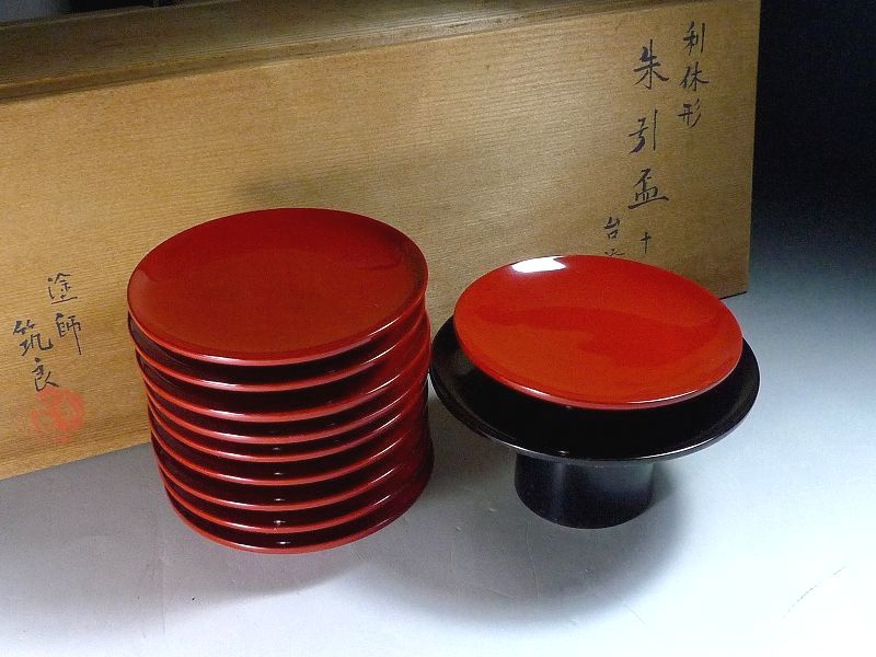 茶懐石道具 利休形 塗師 筑良造 朱引盃10客+台添 共箱 漆器 黒塗盃台 朱塗り 食器 酒器 茶道具