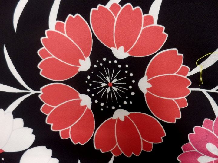 洗える着物 袷 小紋 ポリエステル 着物単品 仕立て上がり 洗える キモノ お洒落着 小紋 Mサイズ 黒地 花柄 No.5