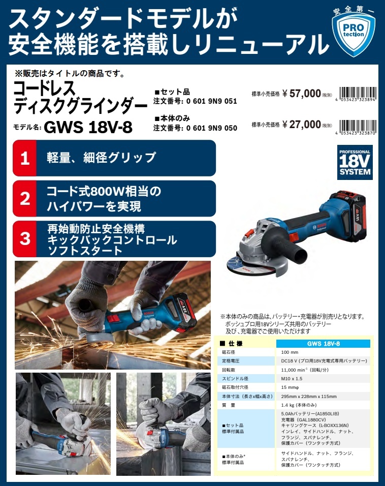 ボッシュ BOSCHコードレスディスクグラインダーGWS18V-85.0Ahバッテリー(A1850LIB)1個+充電器(GAL1880CV)+キャリングケース(L-BOXX136N)付スタンダードモデルが安全機能を搭載しリニューアル■商品説明・軽量・コンパクトなデザインで扱いやすい・軽作業で最速の切削性能を発揮し、生産性も向上・1充電あたりの連続使用時間を最適化し、少ない充電回数でより多くの作業に対応可能・より滑らかなエルゴノミクスデザインの新型グリップを採用し、優れた操作性と快適性を実現・メタルフランジはボッシュのクリーナーに対応しており、粉じんのない作業が可能■仕様・砥石径:100mm・スピンドル径:M10x1.5・定格電圧: DC18V (プロ用18V充電式専用バッテリー)・回転数:11,000回転/分・スピンドル径:M10 x 1.5・砥石取付穴径:15mmφ・本体サイズ:長さ295mmx幅228mmx高さ115mm・質量:1.4kg(本体のみ)■セット品標準付属品・5.0Ahバッテリー(A1850LIB) ・充電器(GAL1880CV)・キャリングケース(L-BOXX136N) ・インレイ・サイドハンドル・ナット・フランジ・スパナレンチ・保護カバー(ワンタッチ方式)
