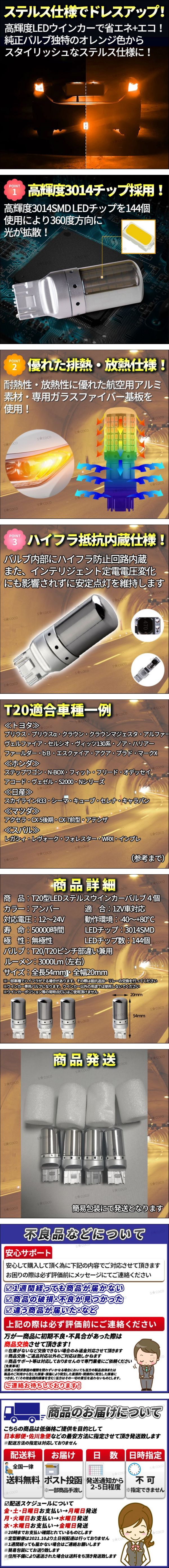 | ステルスウインカー バルブ T20 LEDバルブ 4個セット アンバー ウィンカーバルブ 無極性 ステルス球 12V ハイフラ抵抗内蔵 ピンチ部違い | |||