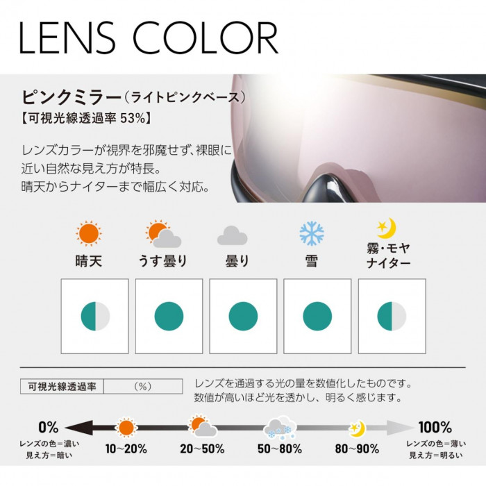| 仕様 | フレーム:シャイニーブラック レンズ:ライトピンクベース ミラー:ピンクミラー 可視光線透過率:53% UVプロテクション ツインアジャストベルト センターバックル 撥水性ベルト 大型メガネ可(幅150mm、高さ50mmまで対応) |