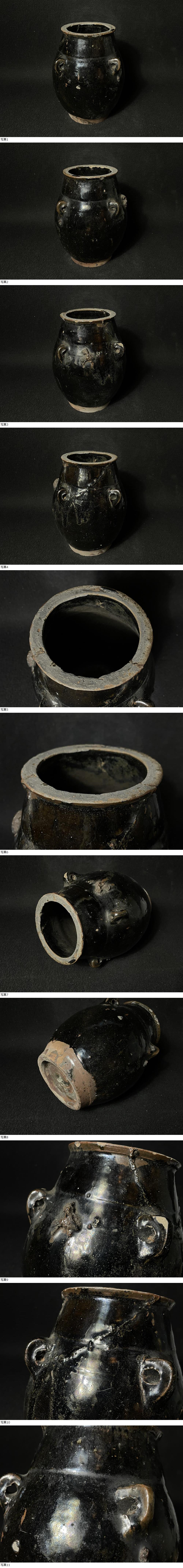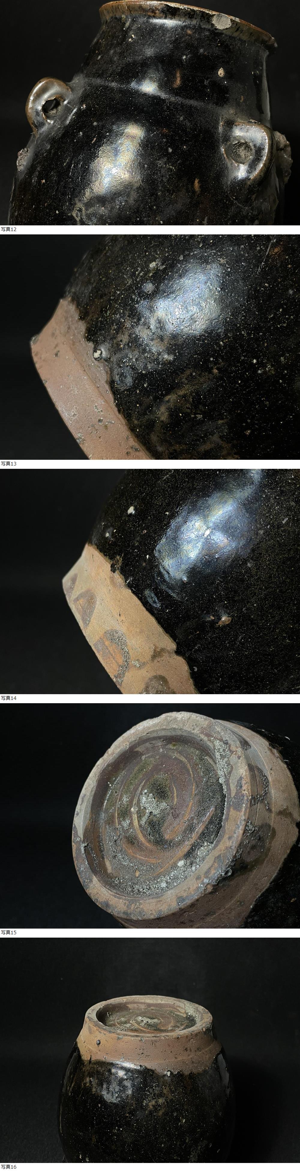 | 琉球古陶 壺屋焼 黒釉四耳壺 古琉球焼 アンダガーミ 四耳脂壺 油壺 花瓶 古典焼 高さ約22.5cm |