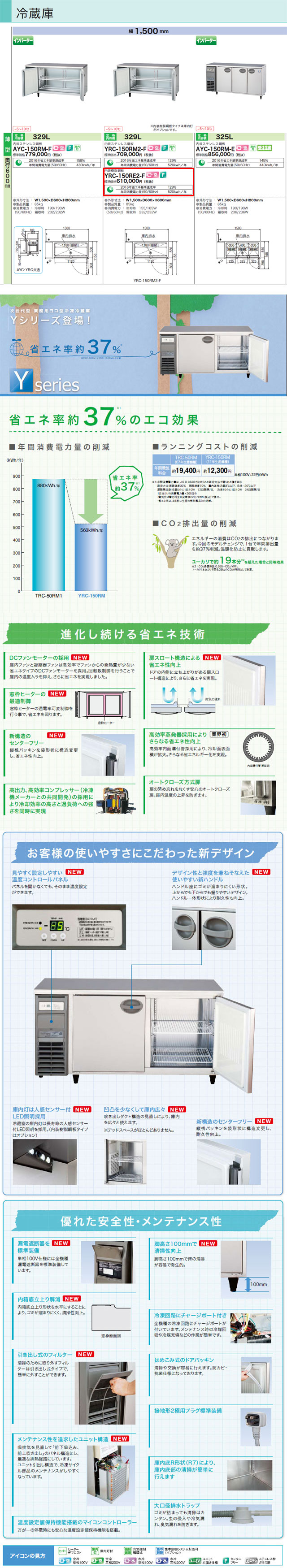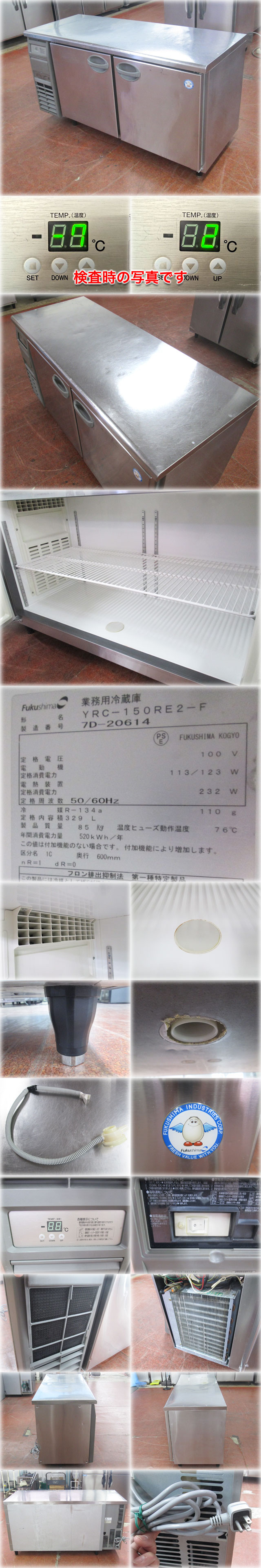 フクシマ 冷蔵コールドテーブル YRC-150RE2-F を出品いたします。 ■特徴■ 進化し続ける省エネ技術 省エネ率約37% DCファンモーターの採用 庫内ファンと凝縮器ファンは高効率で ファンからの発熱量が少ない 省エネタイプのDCファンモーターを採用。 回転数制御を行うことで庫内の温度ムラを抑え、 さらに省エネを実現しました。 窓枠ヒーターの最適制御 窓枠ヒーターの通電率可変制御を 行う事で、省エネを図ります。 扉スロート構造による省エネ性向上 ドアの内側に立ち上がりがある扉スロート構造により、 さらに省エネを実現。 高効率蒸発器採用によりさらなる省エネ性向上 高効率内面溝付管採用により、冷却面表面積が拡大。 さらなる省エネルギー化を実現。 見やすく設定しやすい温度コントロールパネル パネルを開かなくても、そのまま温度設定ができます。 デザイン性と強度を兼ねそなえた 使いやすい新ハンドル ハンドル座にゴミが溜まりにくい形状。 上からでも下からでも握りやすいデザイン。 ハンドル一体形状により耐久性も向上。 ■仕様■