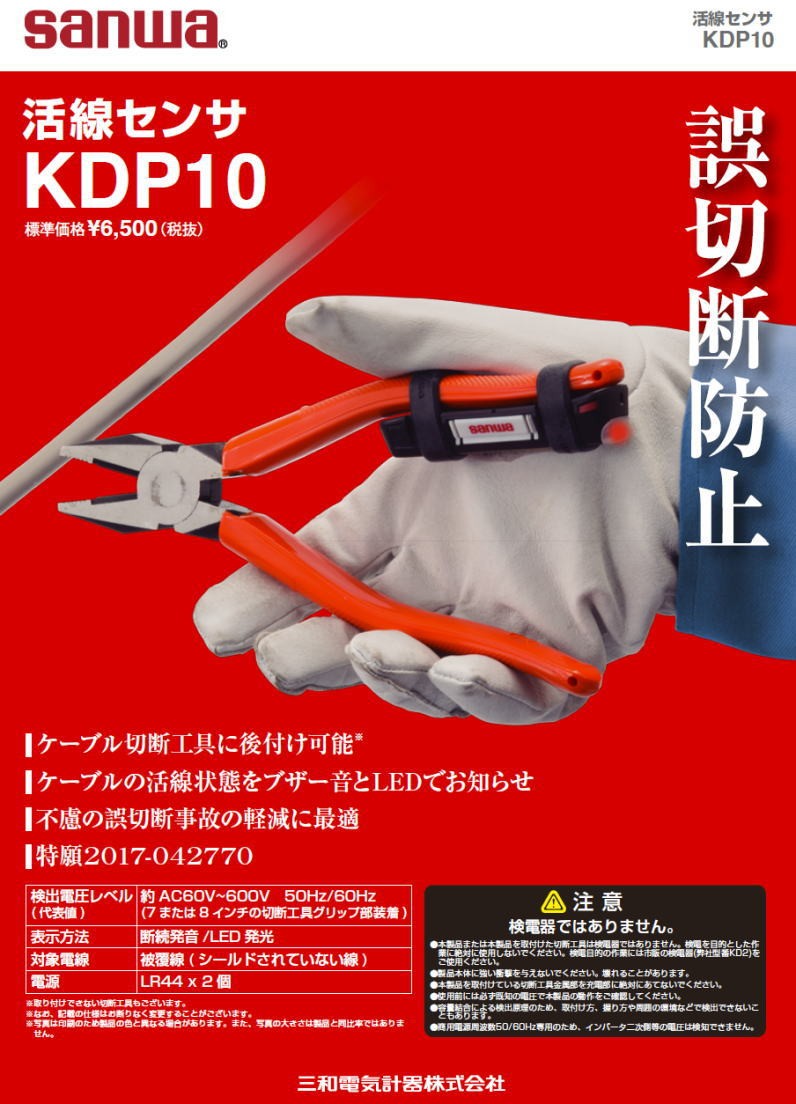 ![]() ![]() ケーブル切断工具に取り付ける活線センサ ケーブル切断工具に後付け可能※ ケーブルの活線状態をブザー音とLEDでお知らせ 不慮の誤切断事故の軽減に最適 特許6467447号取得 ※取り付けできない切断工具もございます。 仕様 検出電圧レベル(代表値):約AC60V~600V 50Hz/60Hz(7または8インチの切断工具グリップ部装着) 表示方法:断続発音/LED発光 対象電線:被覆線(シールドされていない線) 電源:LR44x2個 電池寿命:約5ヵ月 寸法/重量:H23×W77×D13mm/約13g 検電器ではありません。 ●本製品または本製品を取付けた切断工具は検電器ではありません。検電を目的とした作業に絶対に使用しないでください。検電目的の作業には市販の検電器(弊社型名KD2)をご使用ください。 ●製品本体に強い衝撃を与えないでください。壊れることがあります。 ●本製品を取付けている切断工具金属部を充電部に絶対にあてないでください。 ●使用前には必ず既知の電圧で本製品の動作をご確認してください。 ●容量結合による検出原理のため、取付け方、握り方や周囲の環境などで検出できないこともあります。 ●商用電源周波数50/60Hz専用のため、インバータ二次側等の電圧は検知できません。 メーカー:三和電気計器株式会社 |
