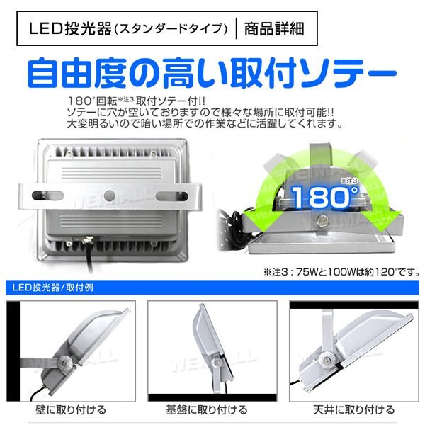 | LED採用の省エネ投光器ライトです。 20Wと省電力で、従来の200W相当の明るさです。 IP65規格の防水仕様!ライトアップ照明に。 ホール、倉庫、町内の防犯灯など様々な用途に大活躍します! |