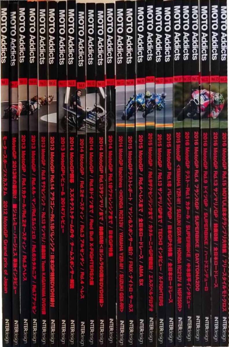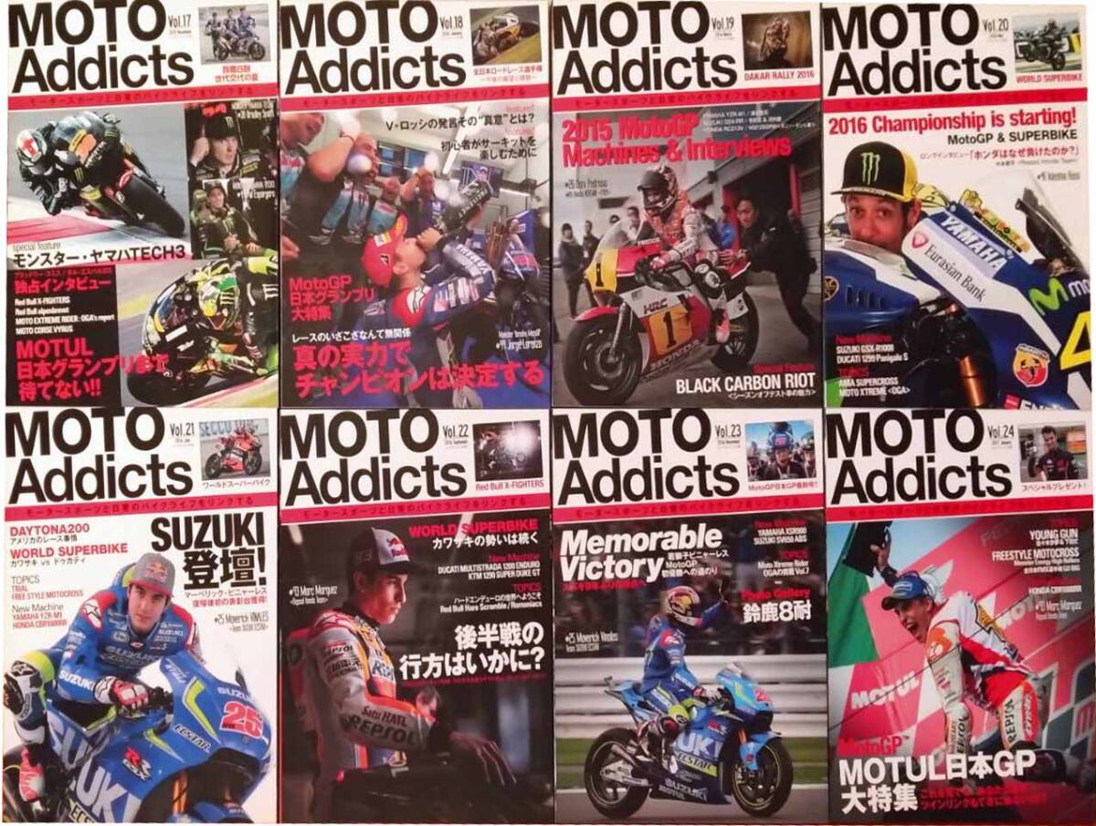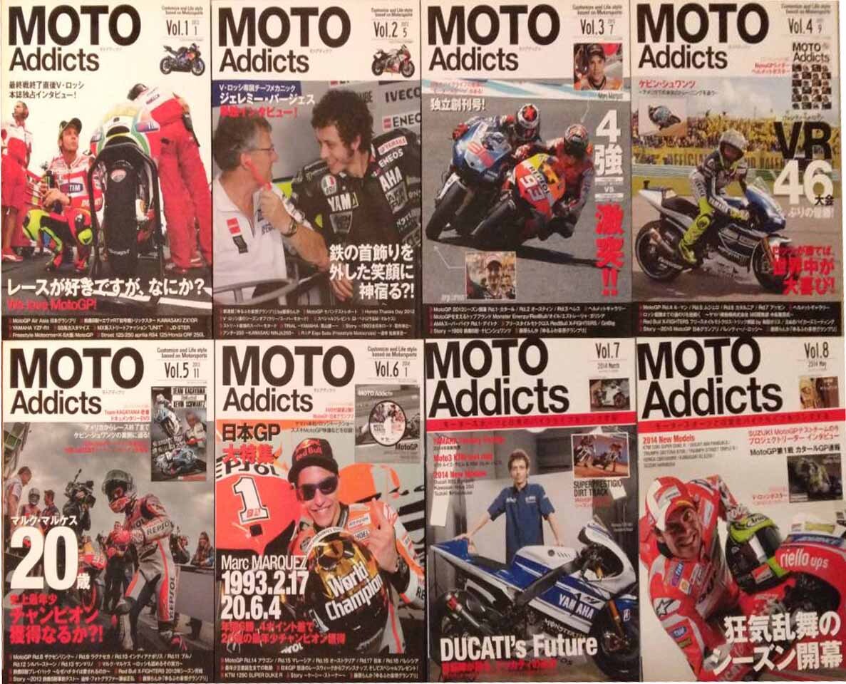 MOTO Addicts 創刊号から最終号までセットでの出品。レースとオートバイをファッショナブルに融合させた珍しい雑誌で今読み返してもなかなか面白いと思います。ロッシやマルケスファン必見。背表紙が一年づつ違う写真になっておりインテリアにも最適。購入後1回程度読んだら本棚へと言う感じなので状態は良いと思います。もちろんたばこも吸いませんのでたばこ臭もありませんが新品ではありませんのでノークレームノーリターンでお願い致します。